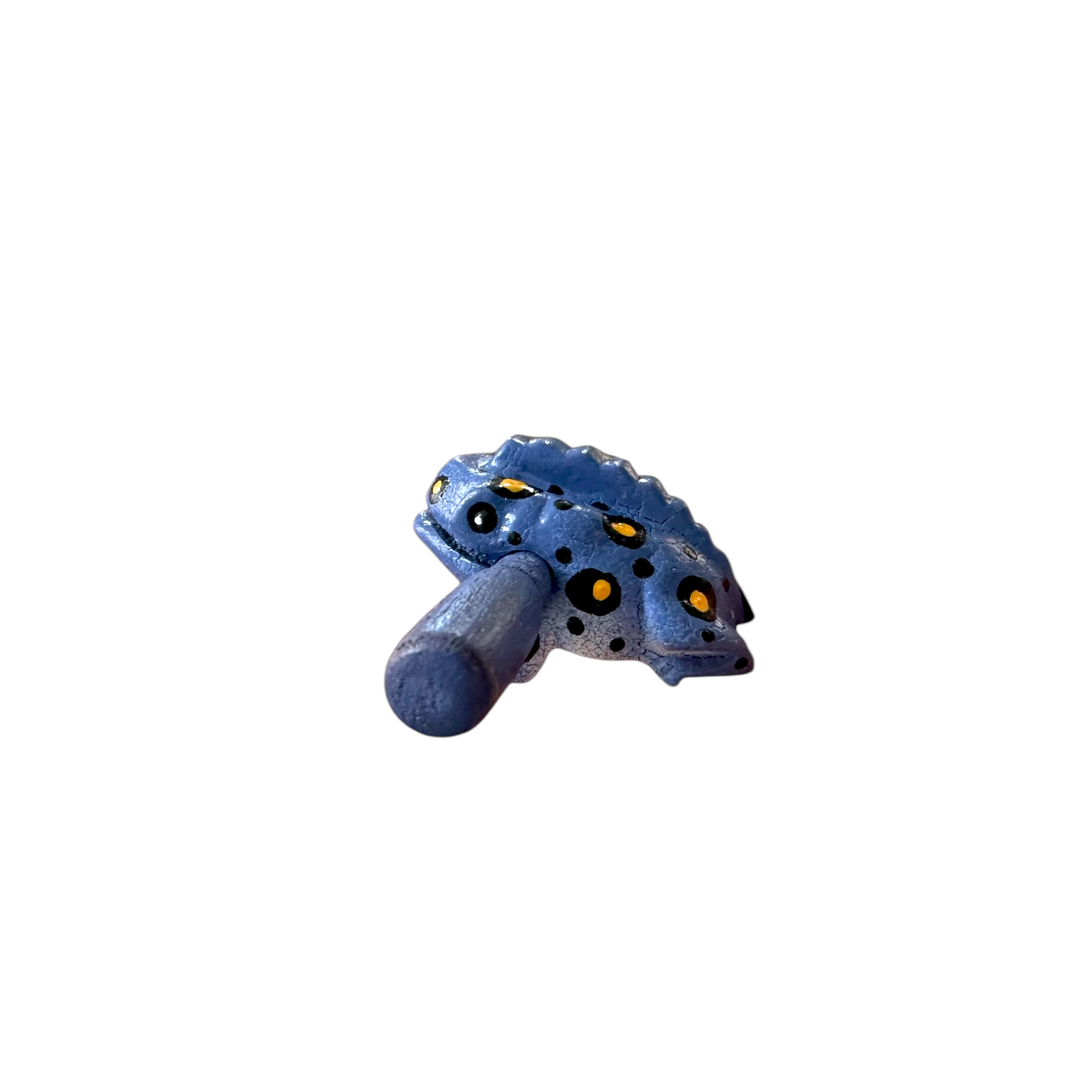 Obtain a relaxing, natural sound anytime and anywhere with the 1.5" Extra Small Blue Dart Frog Musical Frog Percussion Instrument. Handmade with care and precision in Thailand, this unique wooden croaking frog produces a charming "ribbit ribbit" noise when gently stroked with the small wooden mallet. The mallet can be stored safely in the frog's mouth and removed when ready to play. Perfect for animal lovers, music enthusiasts, and those in need of a fidget toy, this percussion instrument also makes a great gift and collectible. At a budget-friendly price, why settle for a drum or guitar when you can have the soothing sound of a frog?