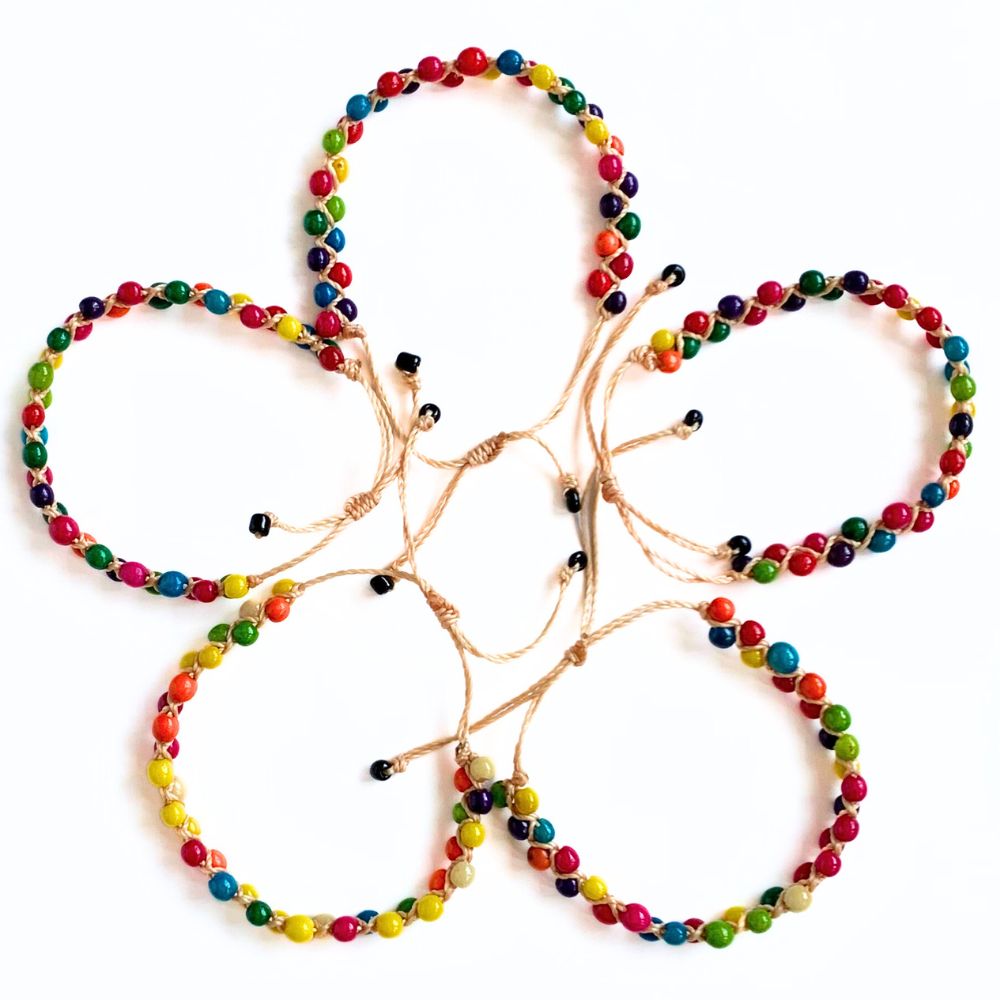 This bracelet is created with brightly dyed achira (canna edulis) seeds that are strung on waxed cord. Adjustable slide closure ensures perfect fit.