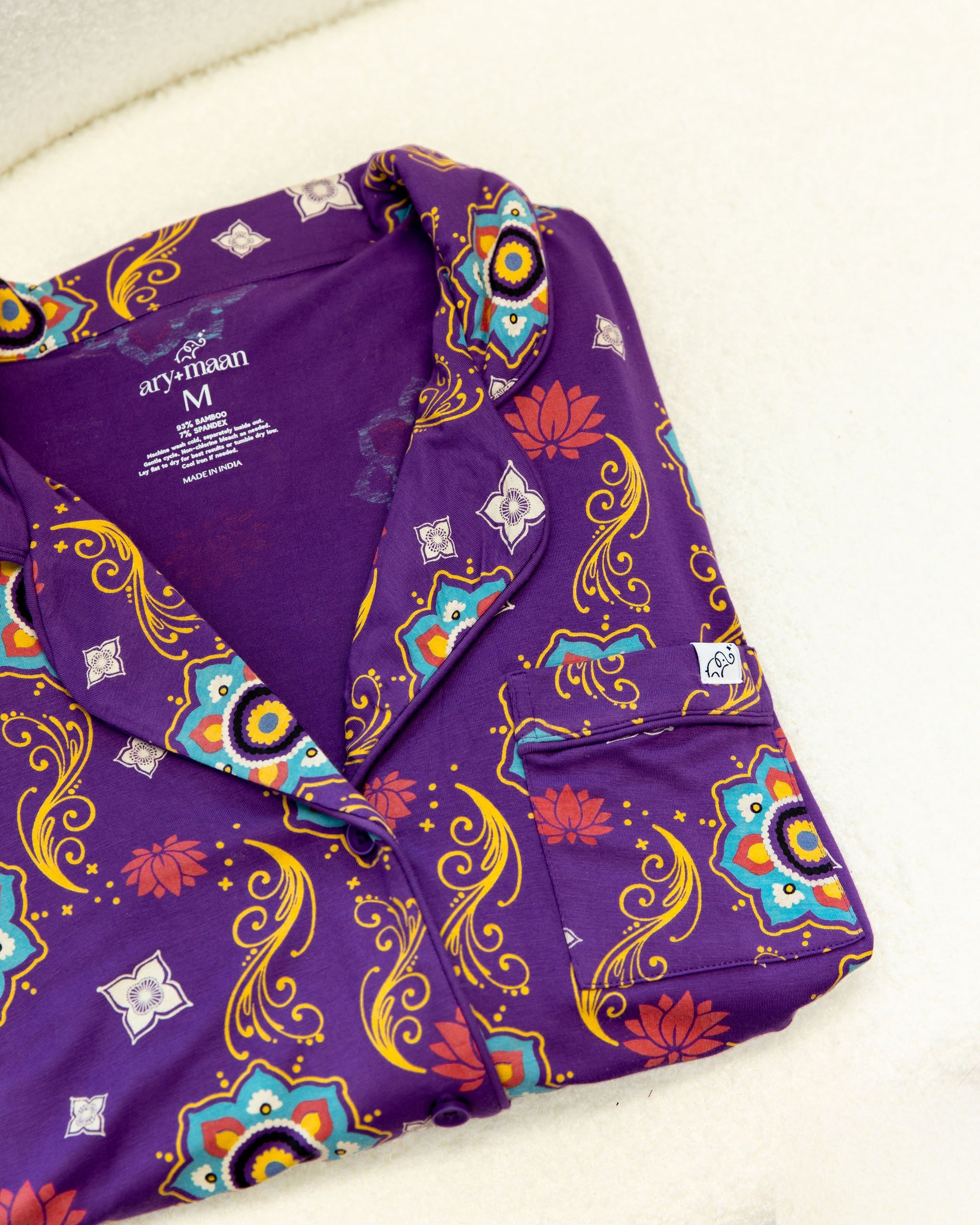 Where comfort meets cultural expression. This long sleeve bamboo button-down sleep shirt brings quiet elegance to your nighttime routine. The Purple Rangoli print adds a beautiful surprise with every wear—an invitation to rest wrapped in heritage.
