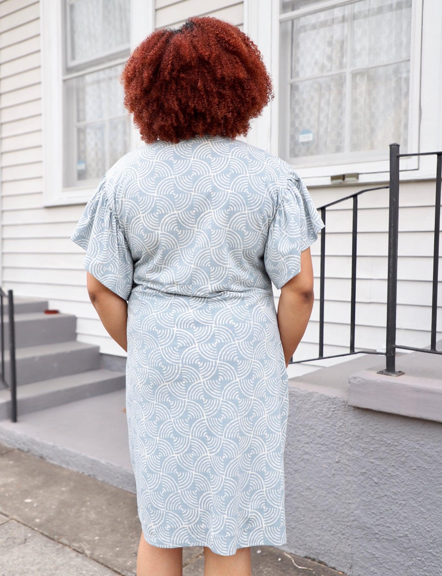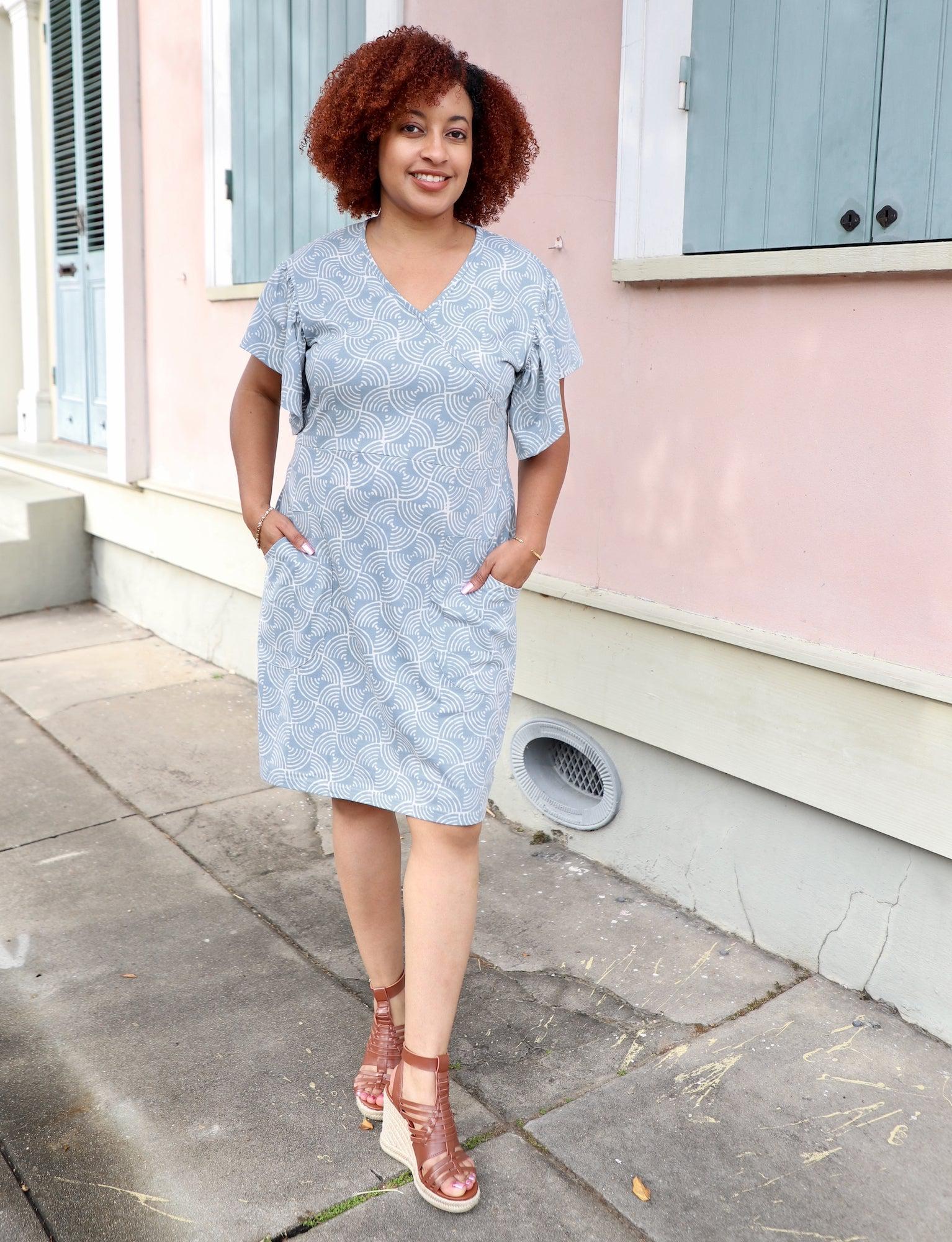 The Aria Organic Dress is the flirty frock your closet needs this season! This light blue pullover dress features feminine ruffle sleeves, front pockets and a v-neck. Curve friendly and flattering for all body types.
