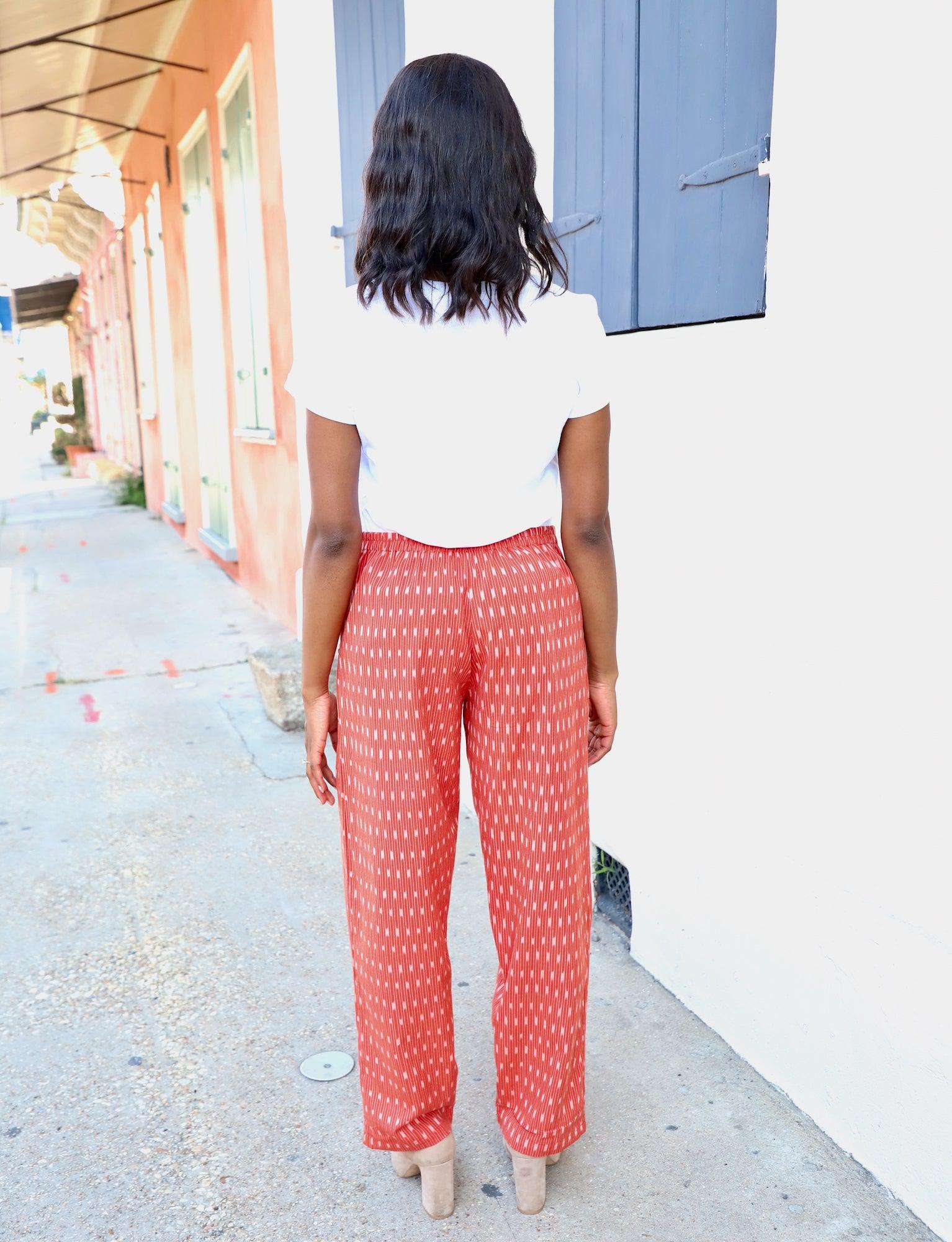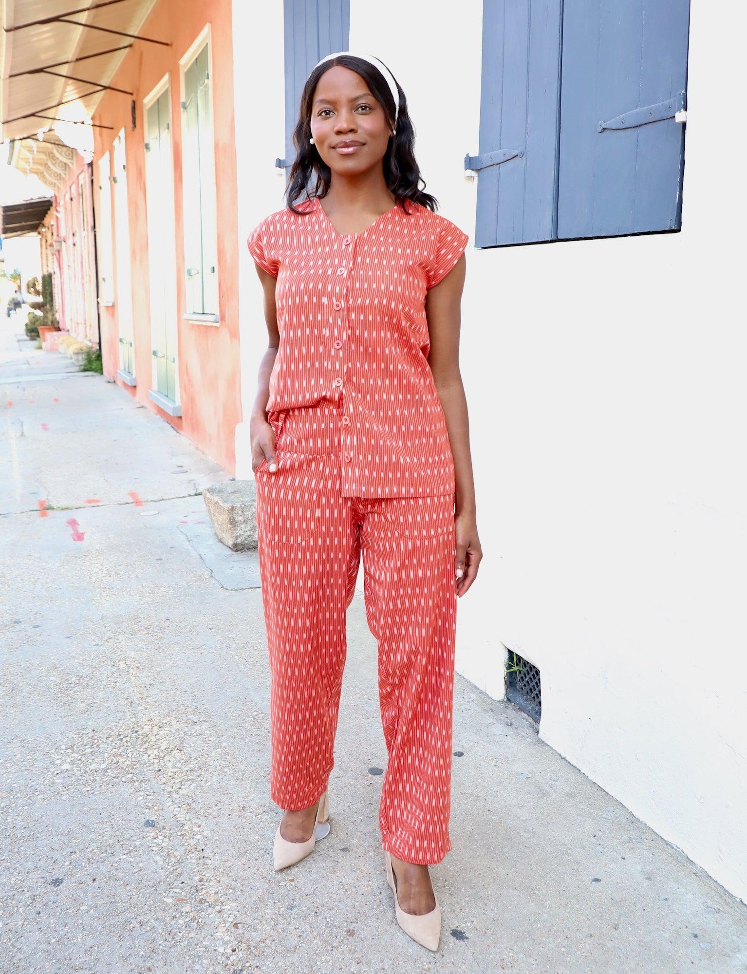 - These red pants pair with our Aurora Button Top.