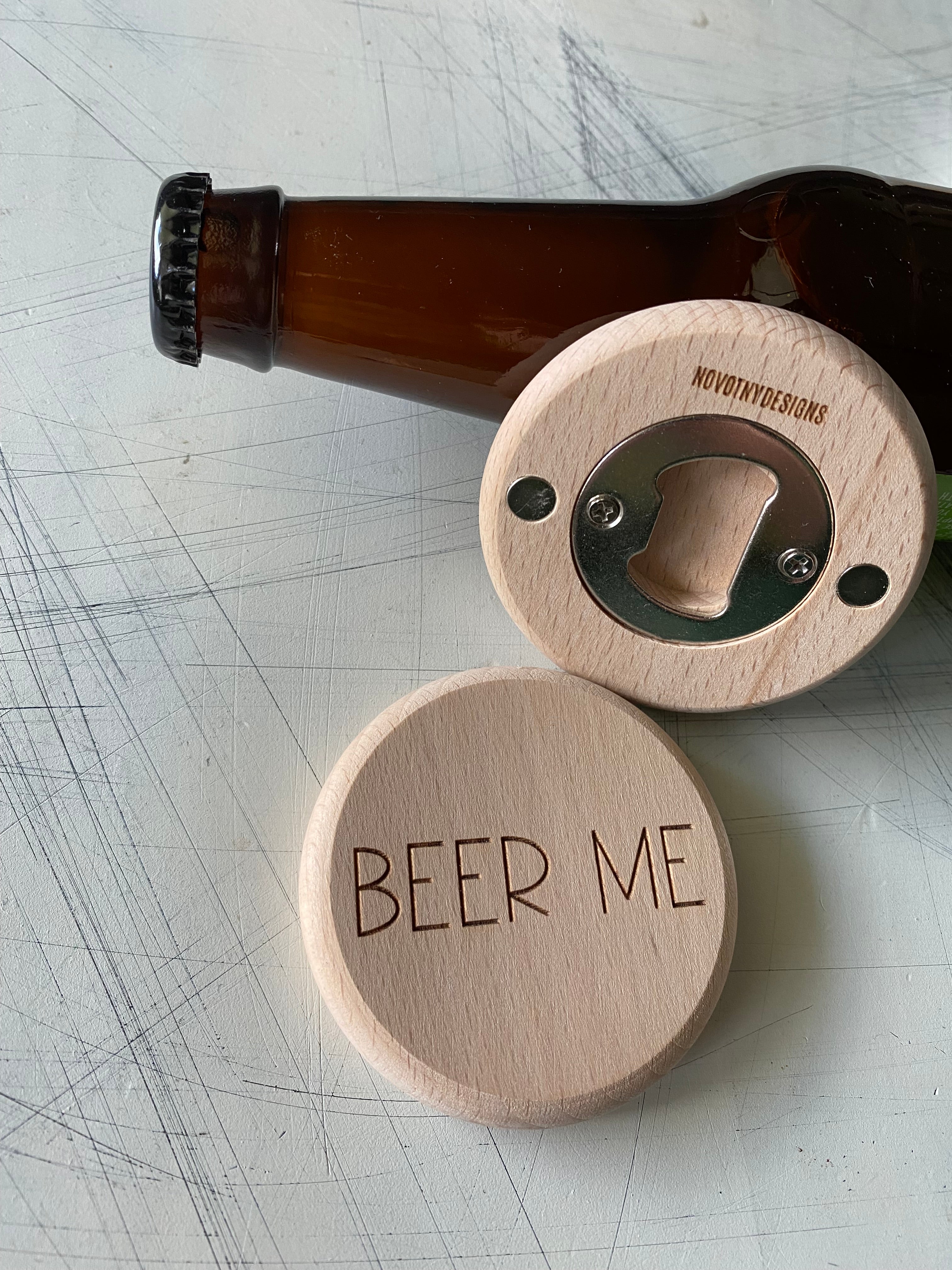 Round bottle opener is engraved beechwood with magnets and metal bottle opener on the reverse. Bottle opener measures 2.5” wide and 0.39” thick.