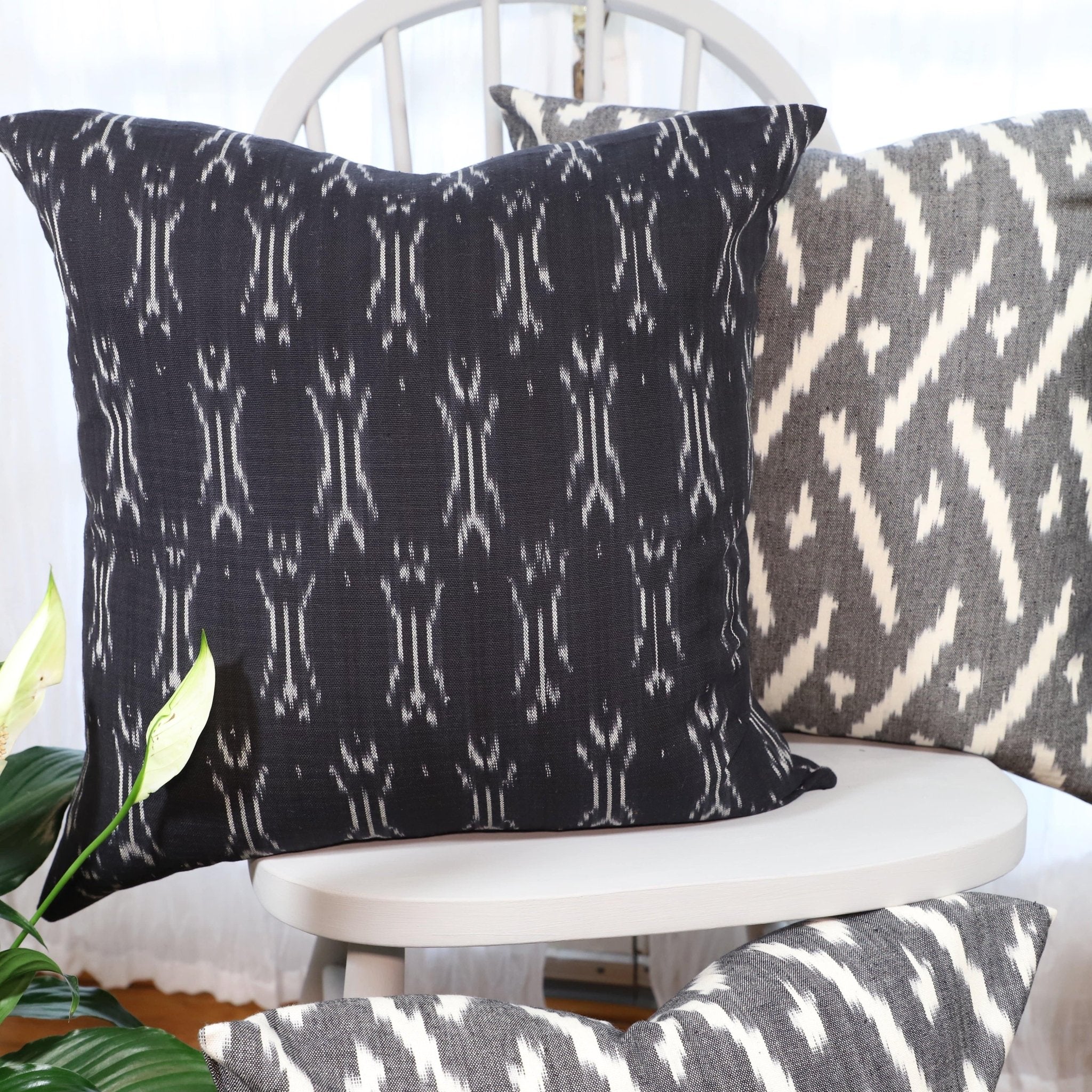 Made of a beautiful hand woven ikat fabric in a black and white geometric pattern, this throw pillow cover would pair great with neutral greys and whites or pop-ups of bold colors. It has a unique handmade quality that will not go unnoticed. The back side has a flap and button closure to make sure your pillow insert stays snug and perfectly styled.