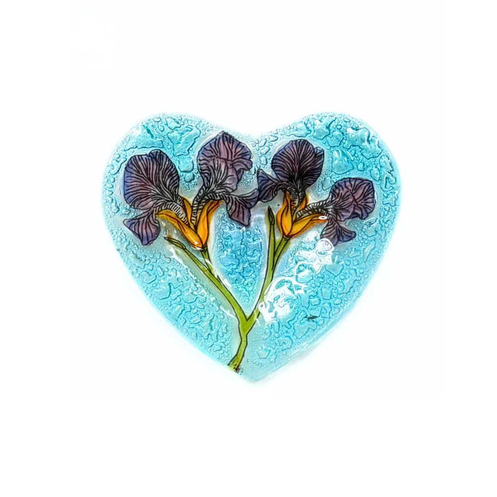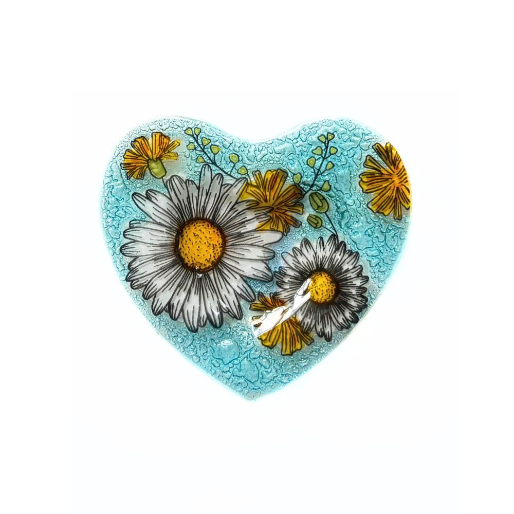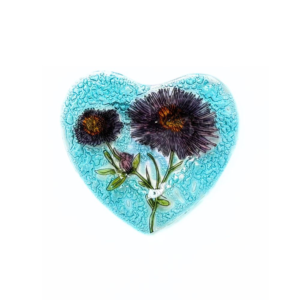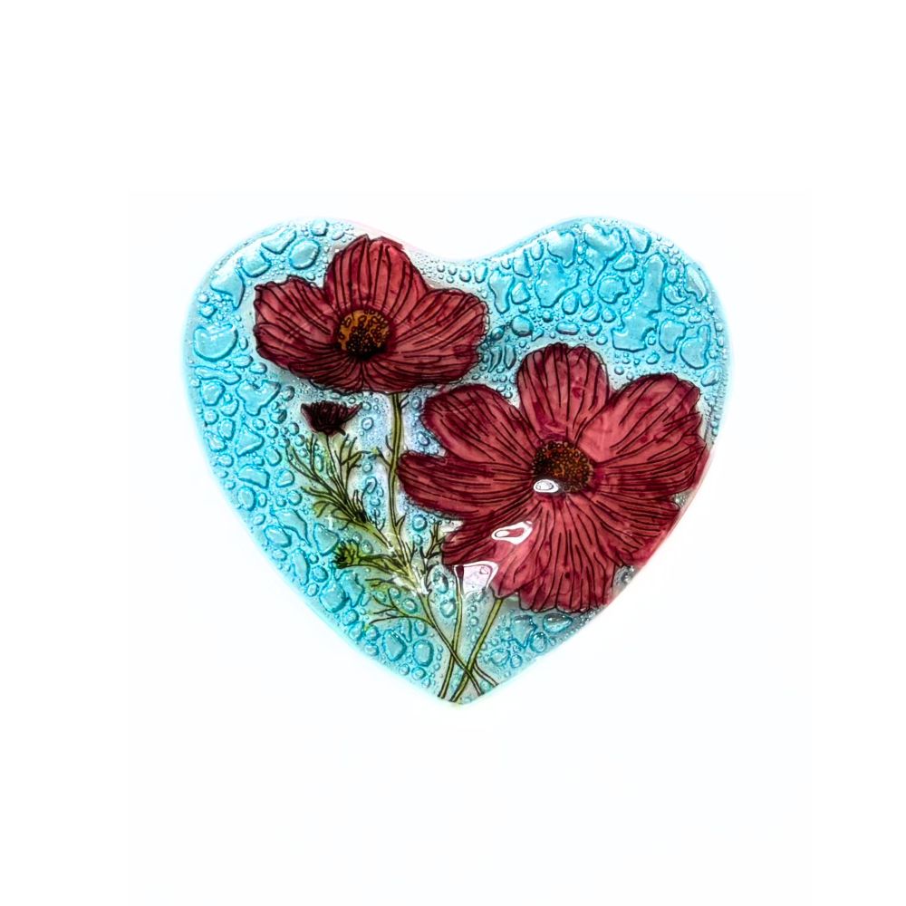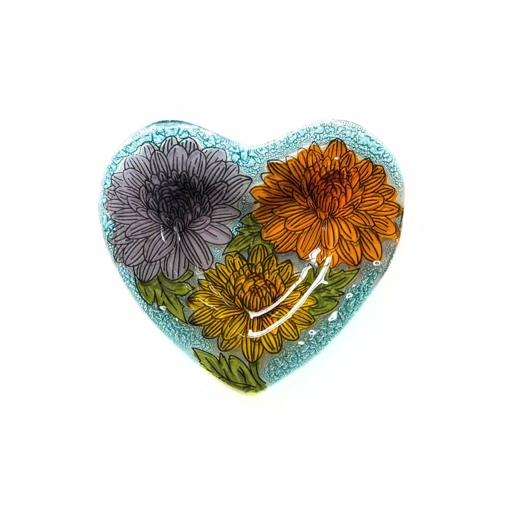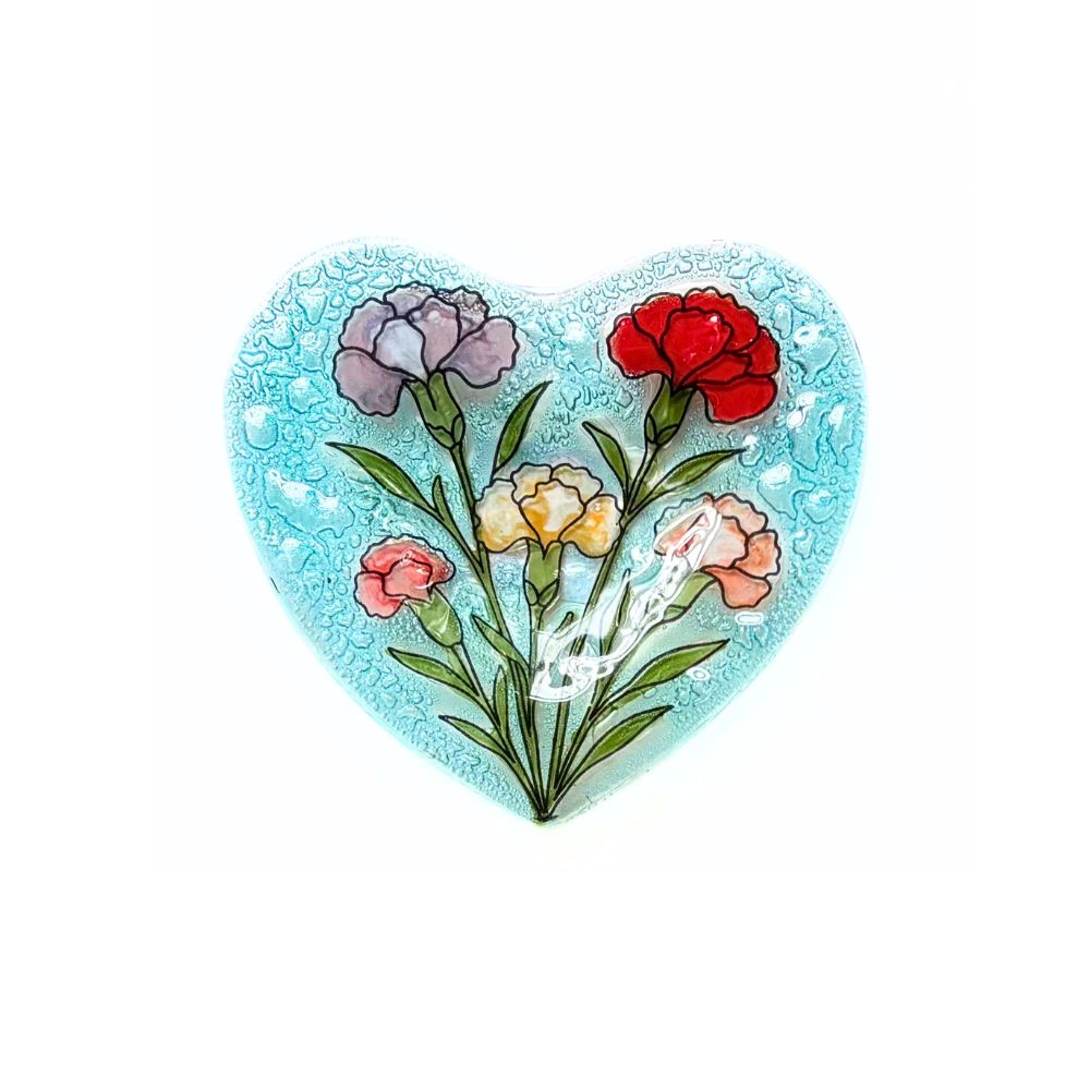 Choose from 12 months of flowers! Pick your birthday blossom or any floral that speaks to you. This unique heart dish is handcrafted from recycled glass and then colors and shapes come to life with fusion. Perfect for rings, small jewelry or change.