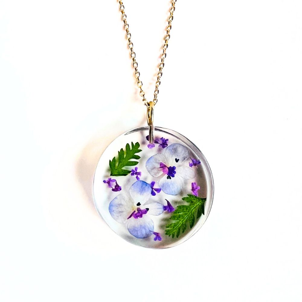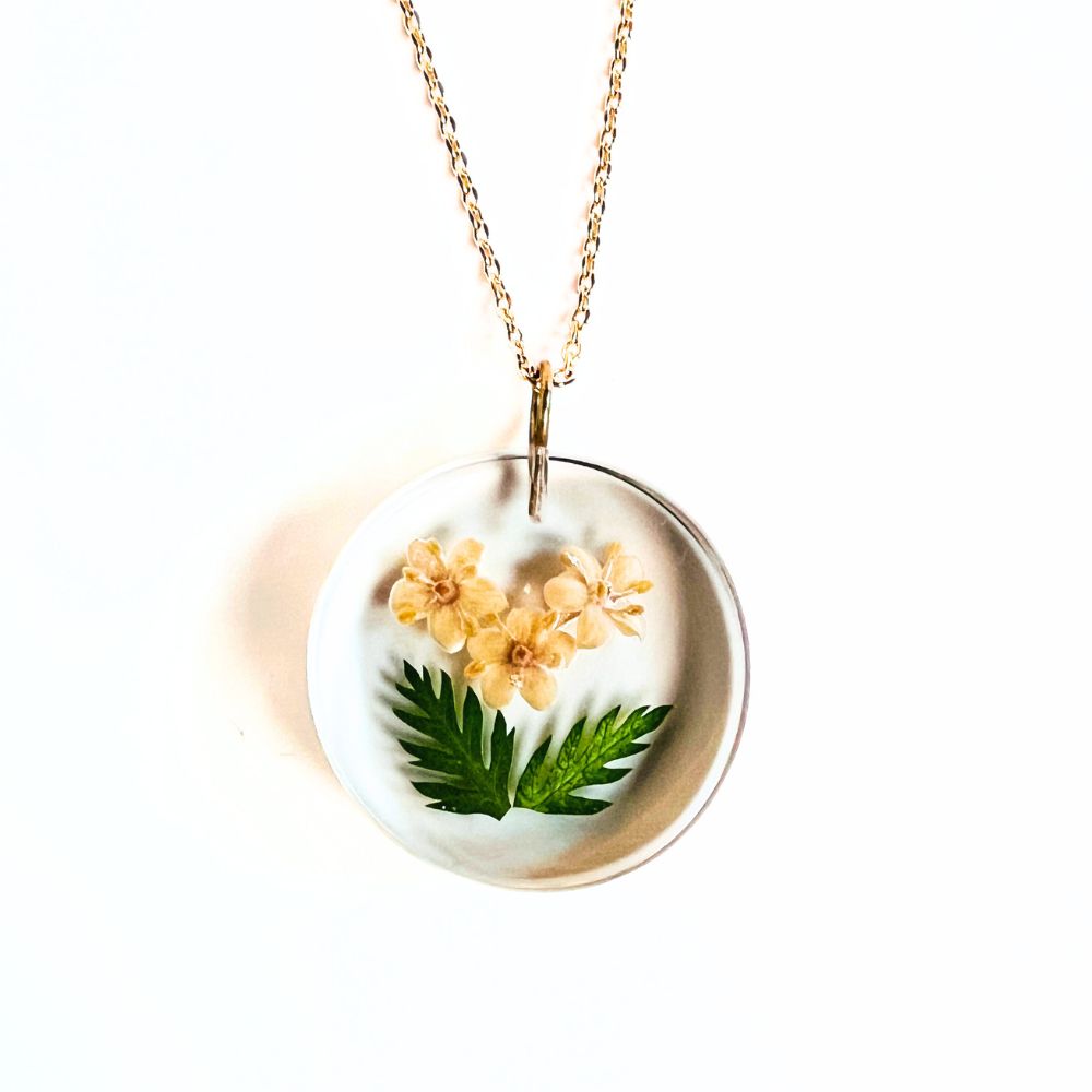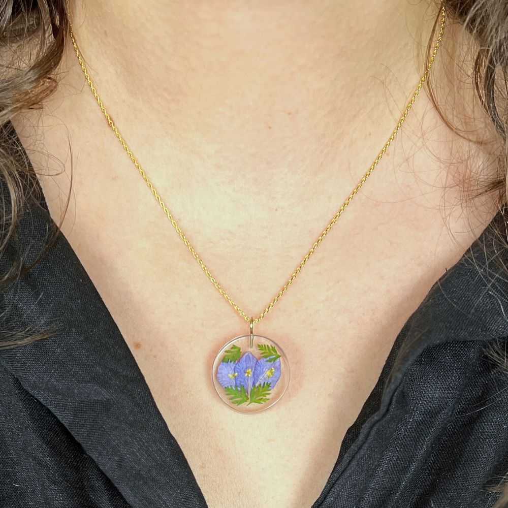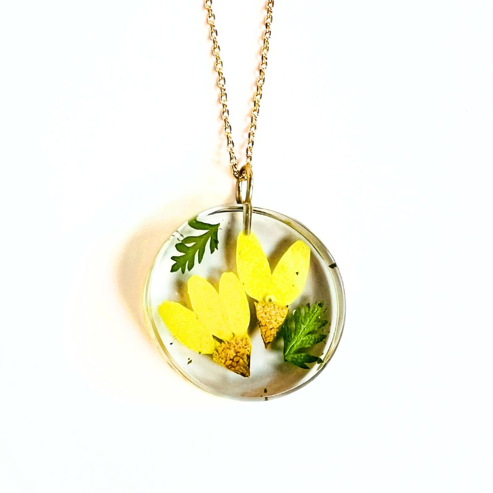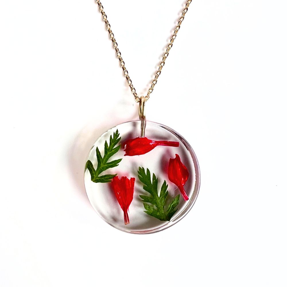 - Materials: sustainable plant-based Eco-resin, real flowers, 14k gold plated bronze chain
