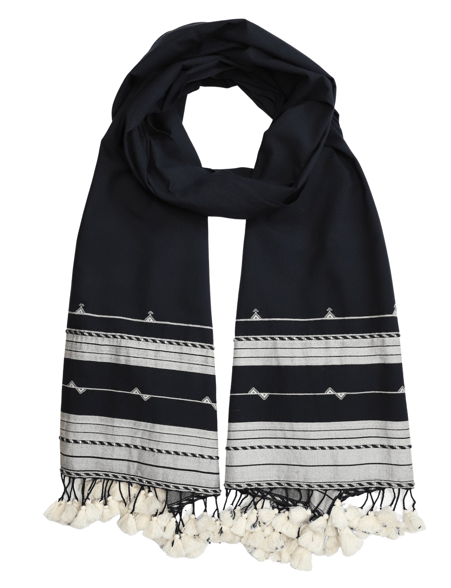 An intricately hand woven scarf of the Kutch community that brings forward the cultures and beliefs of the people. The woven parallel stripes with small geometric motifs give this black scarf a very sophisticated yet casual aura. This is a timeless scarf that is easy to style and incorporate into anyones wardrobe.