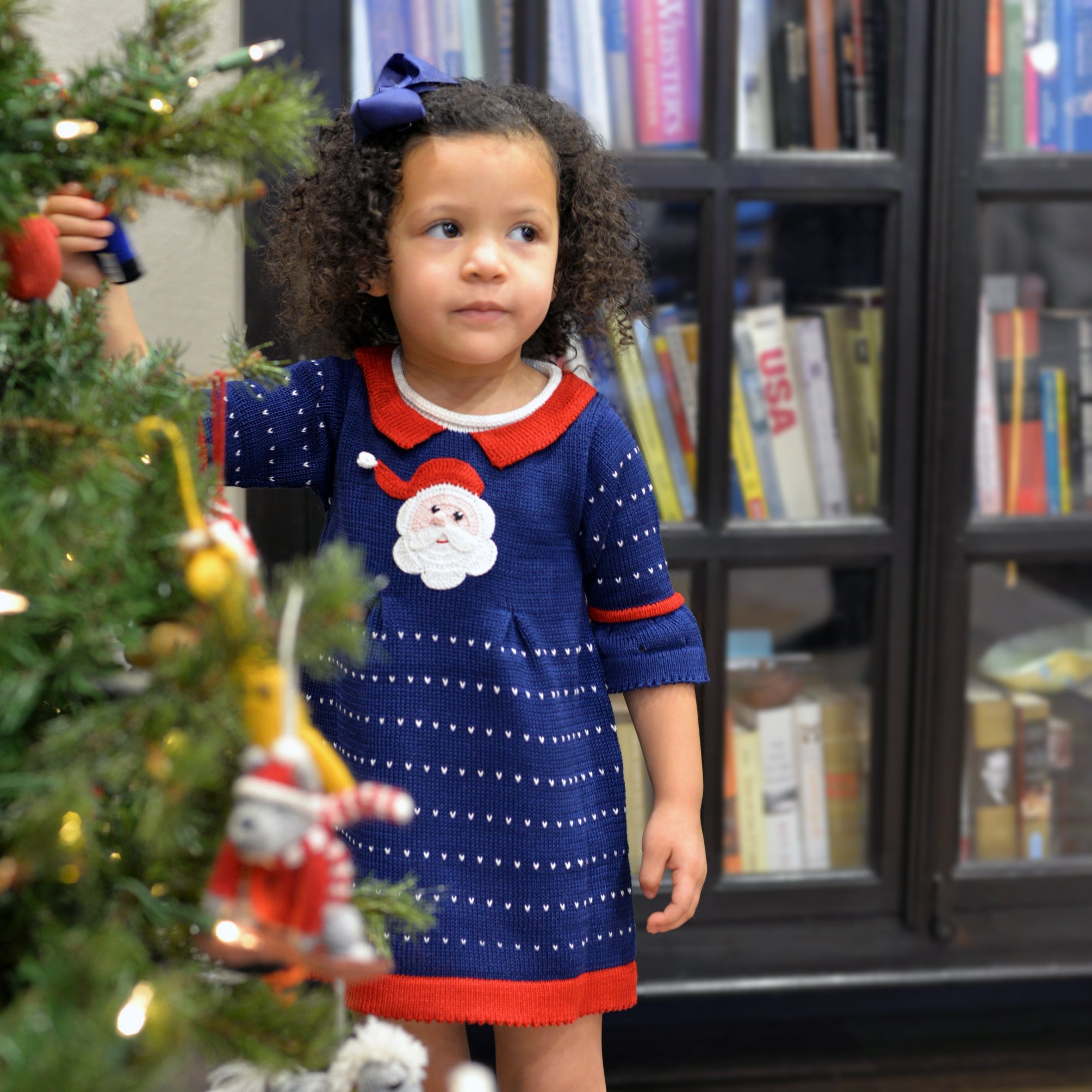 Warm navy blue and red accented knit dress with 3/4 length sleeves and jolly hand-embroidered Santa.