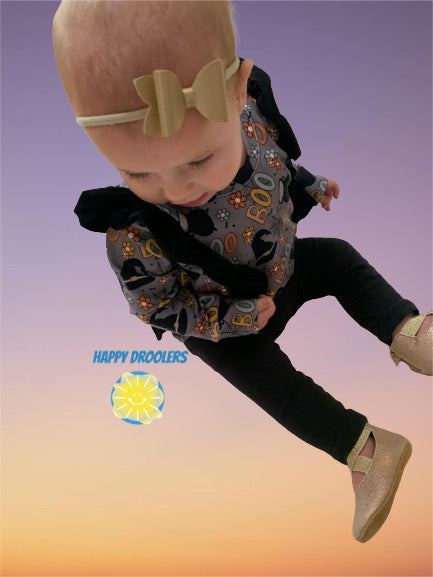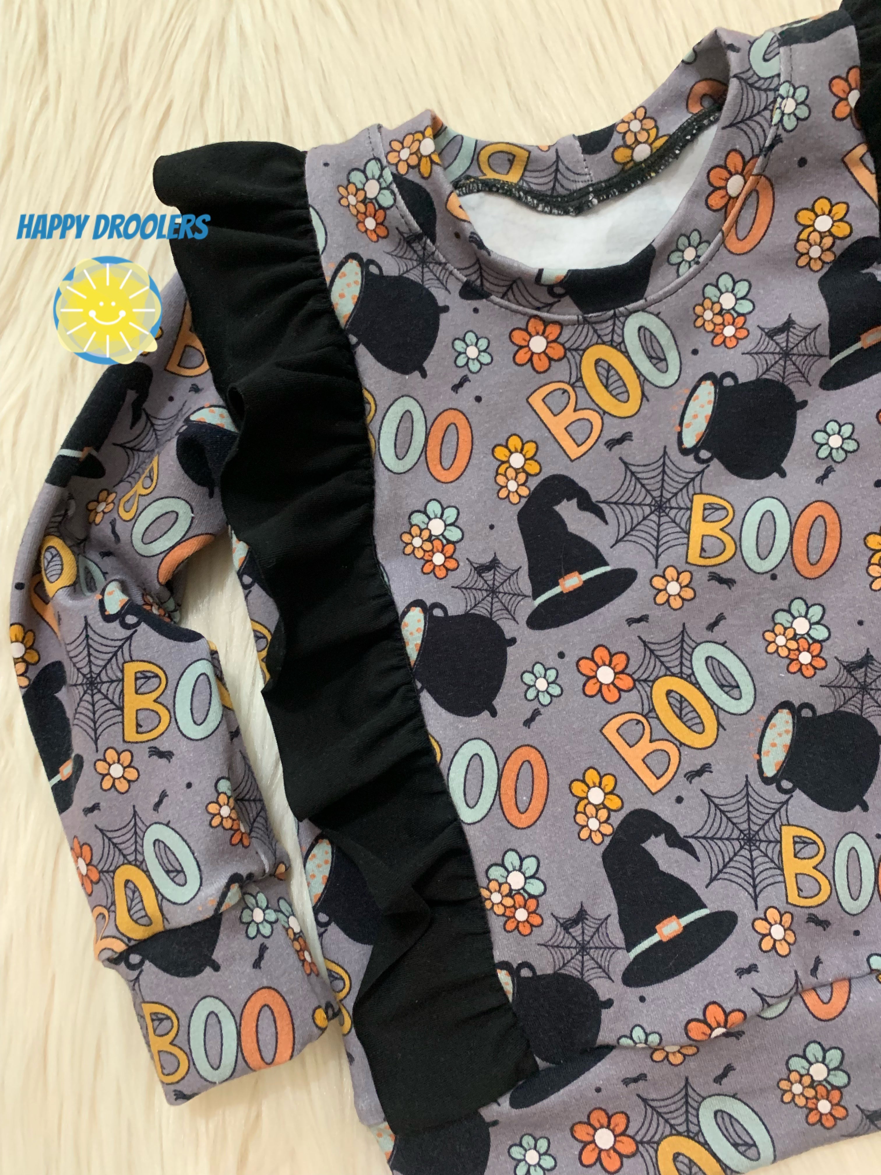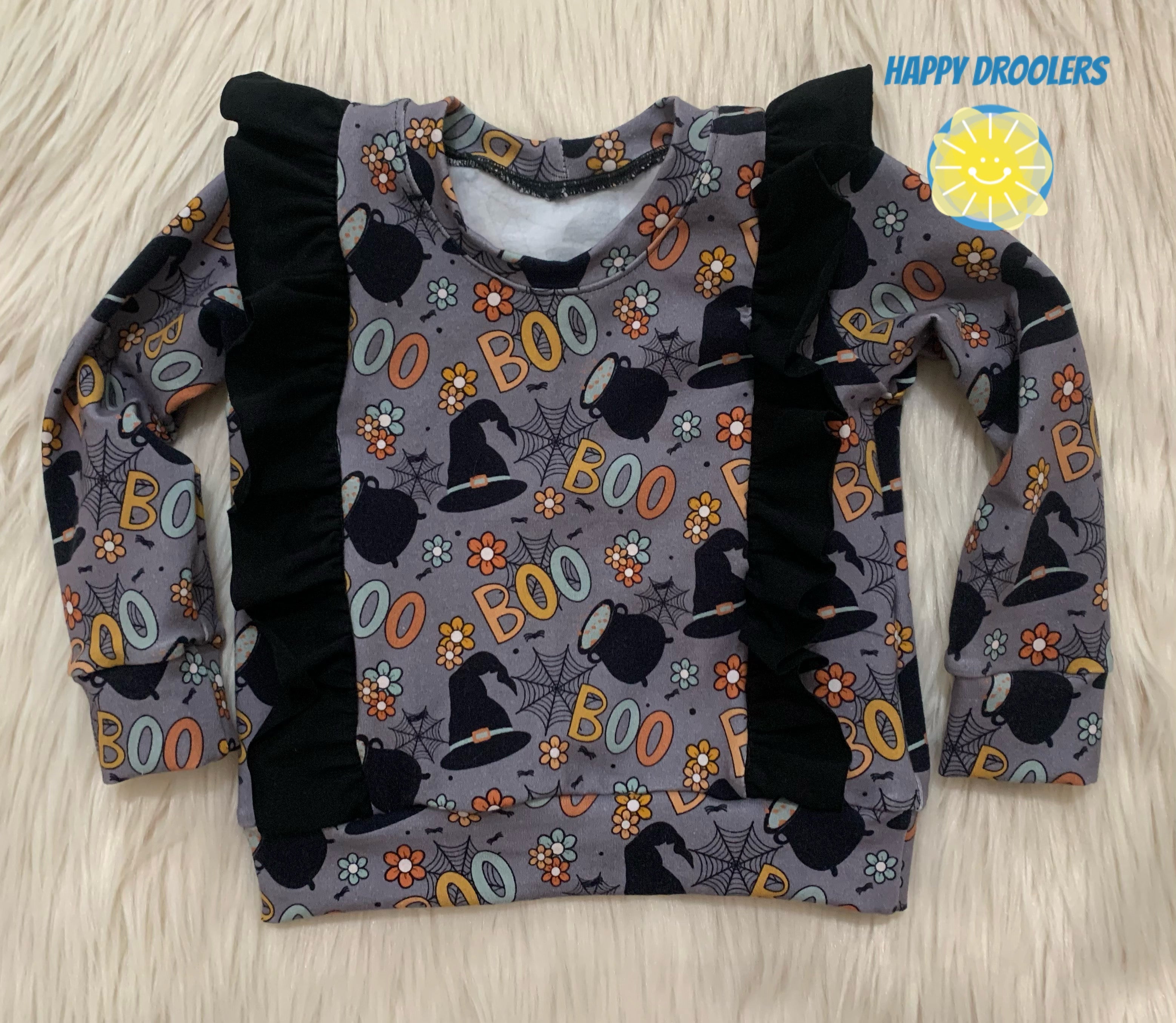 Get this adorable ruffled long sleeve in the Boo! Halloween print