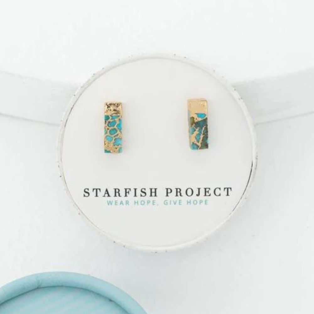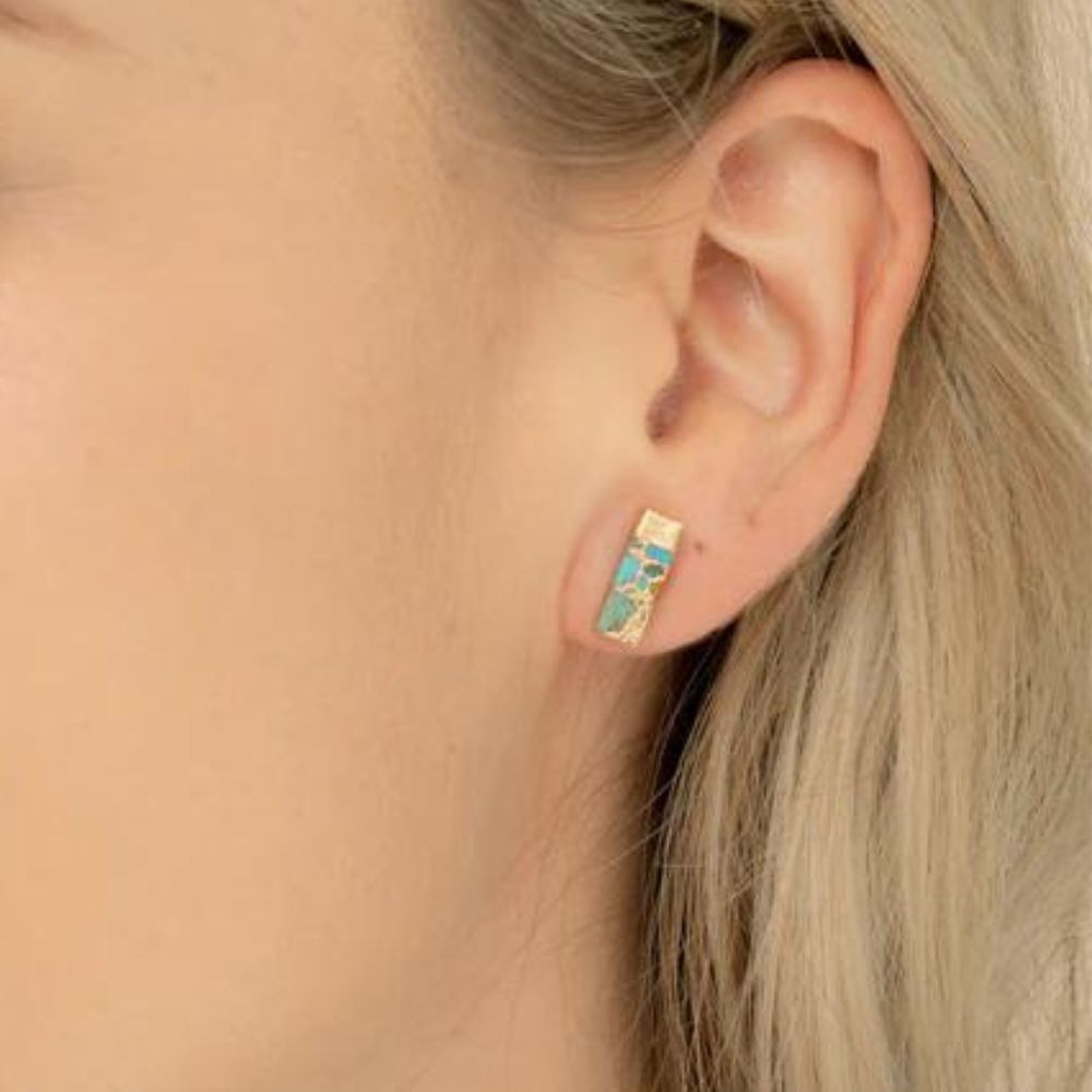 Our Brayden studs are a celebration of unique beauty. Each natural turquoise stone is wrapped in a sleek, 14k plated gold setting on a classic post setting with flecks of gold woven within.