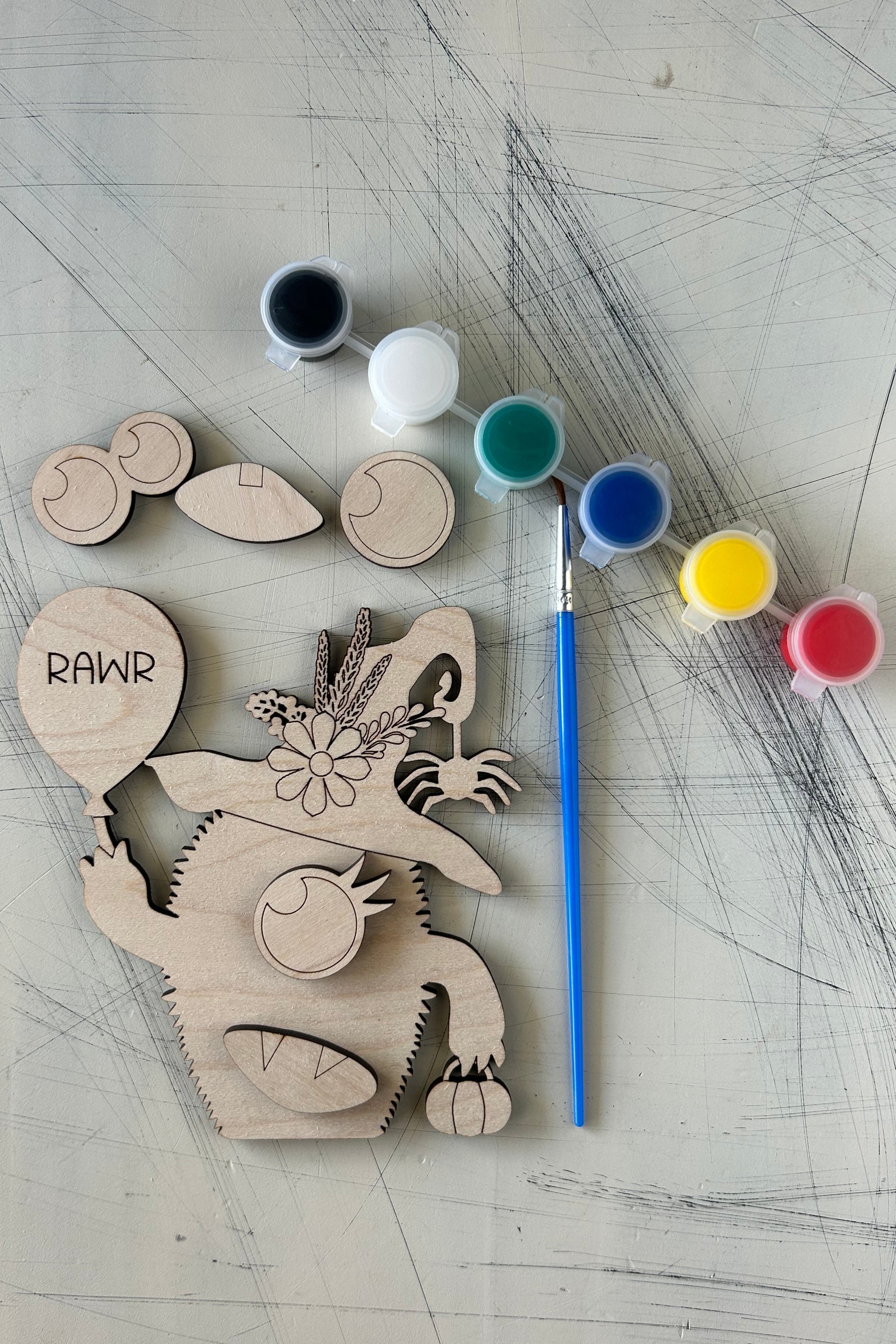 Includes acrylic paints and a brush. Wood canvas, eyes, and mouths are wrapped in shrink plastic.