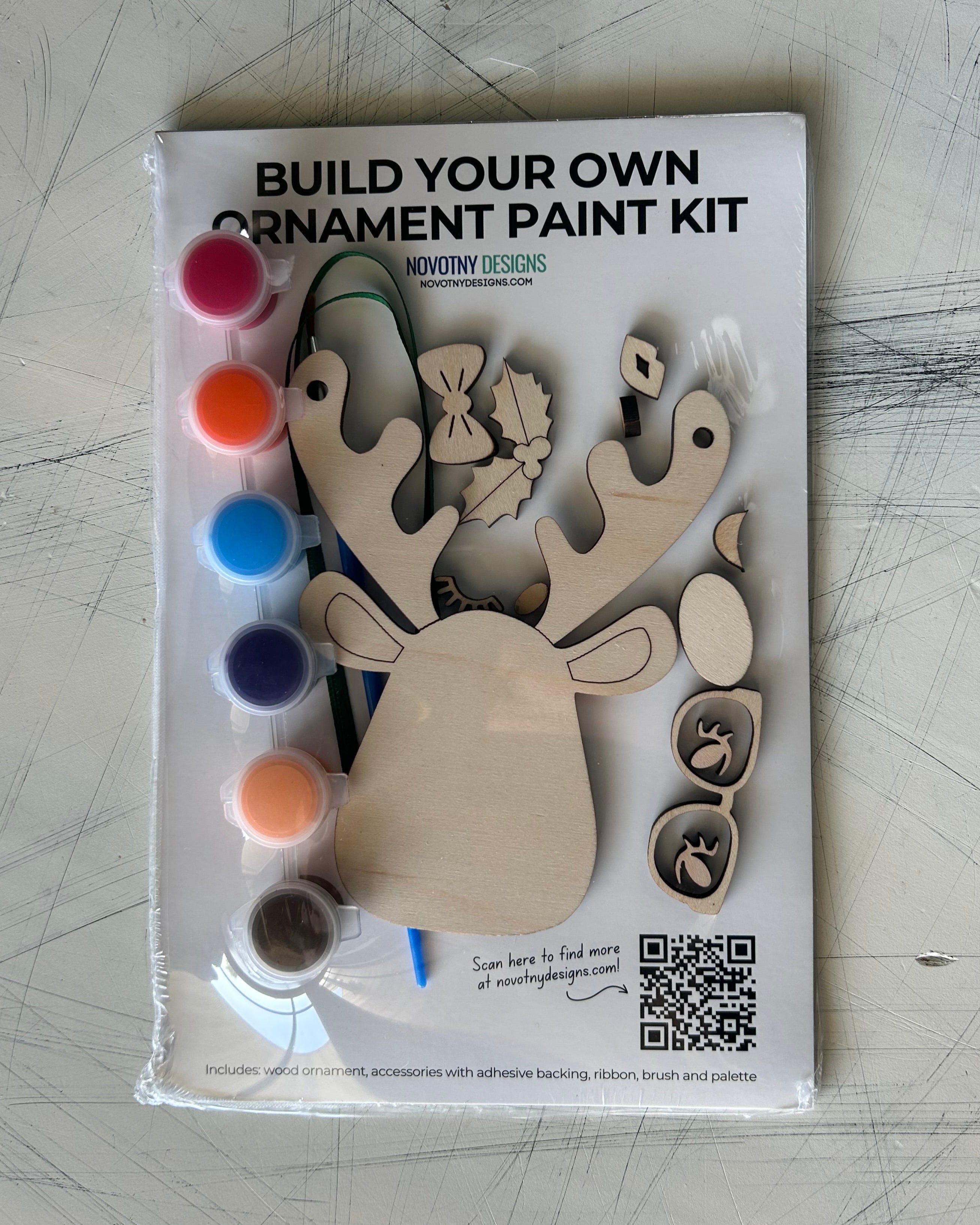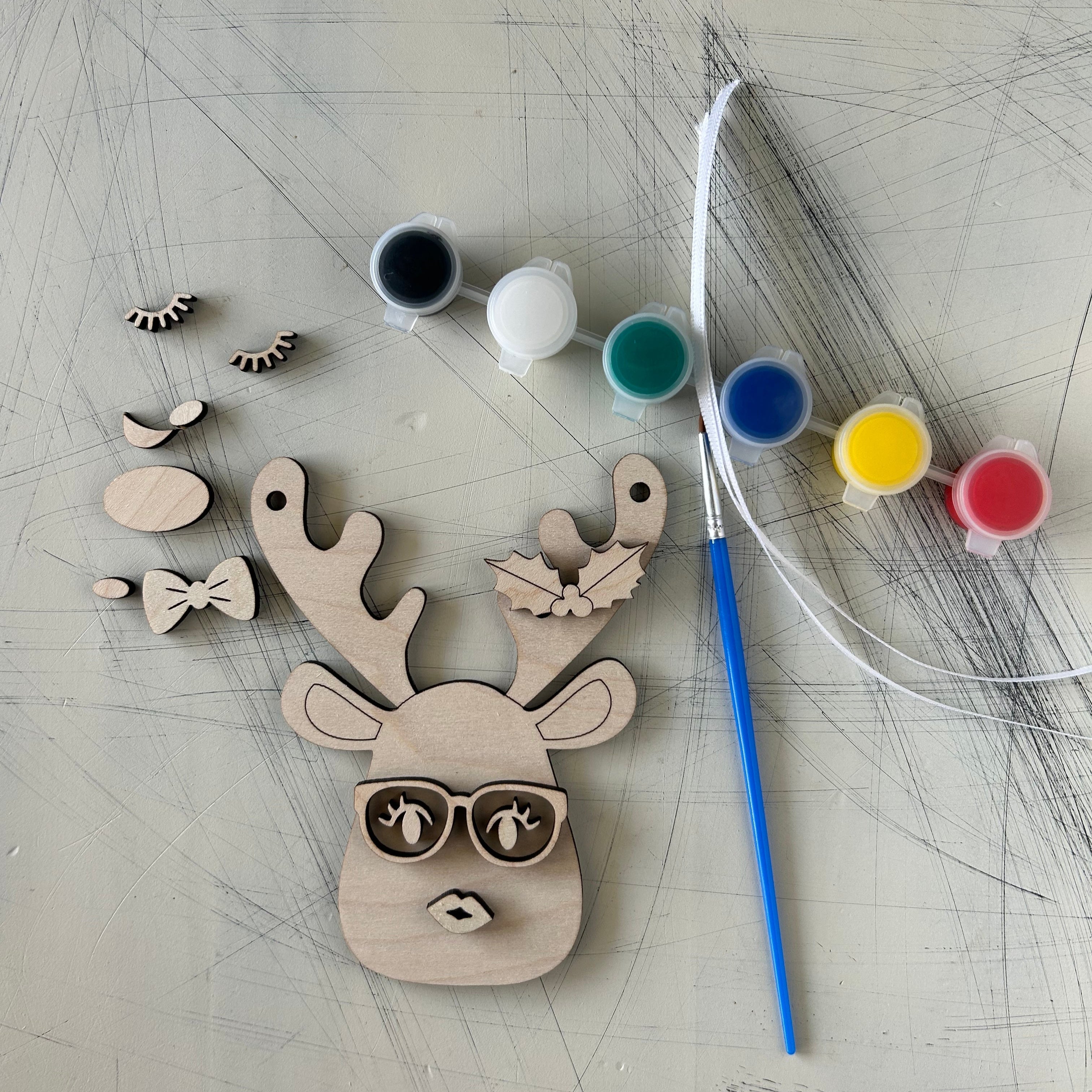 Includes a ribbon to attach and hang on the tree; acrylic paints; and a brush. Wood canvas, ribbon, glasses, eyes, mouths, and other accessories are wrapped in shrink plastic.