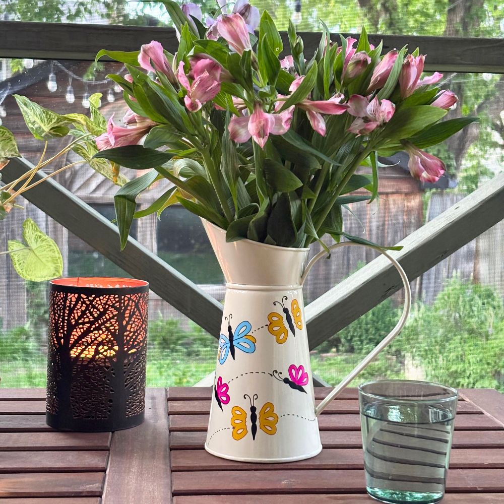 Keep your plant corner classy with this hand-painted watering can. It also doubles as an elegant vase to display your flowers. It's handmade from iron metal painted in soft cream and adorned with hand-painted butterflies all around.