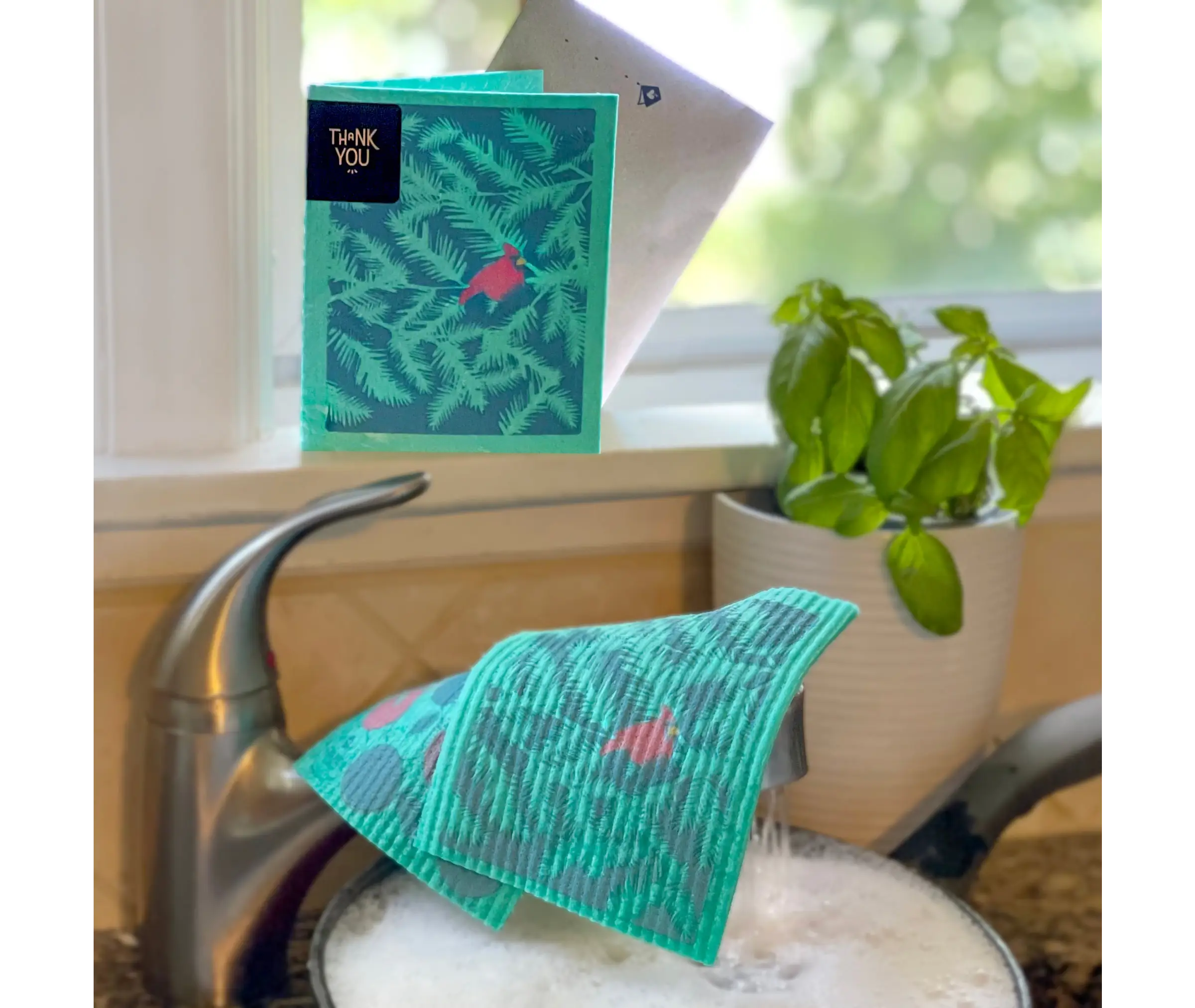 Cardinal Branches Clard goes from a sweet greeting to two genius cleaning cloths in seconds. Not only are male Cardinals beautiful they are a symbolic bird that can represent many things, including hope, love, and connection to nature.