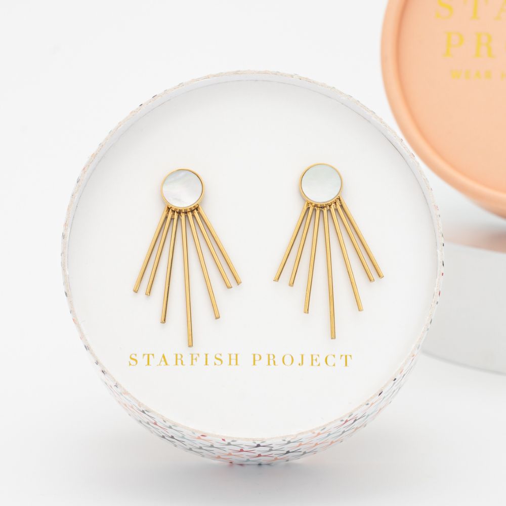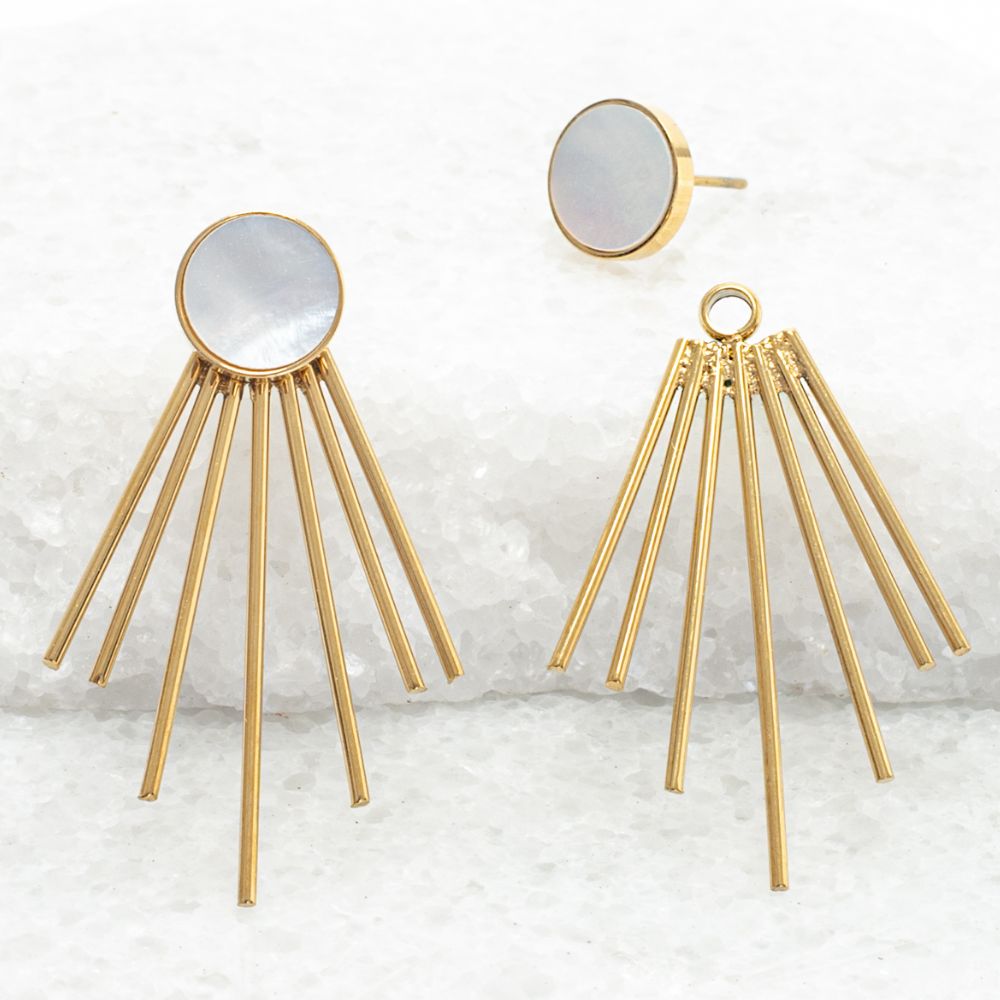Are they studs? Are they dangling fringe? They’re both! These unique earrings give you the freedom to dress things up by adding the gold plated fringe or keep it simple with the effortless white mother-of-pearl studs.