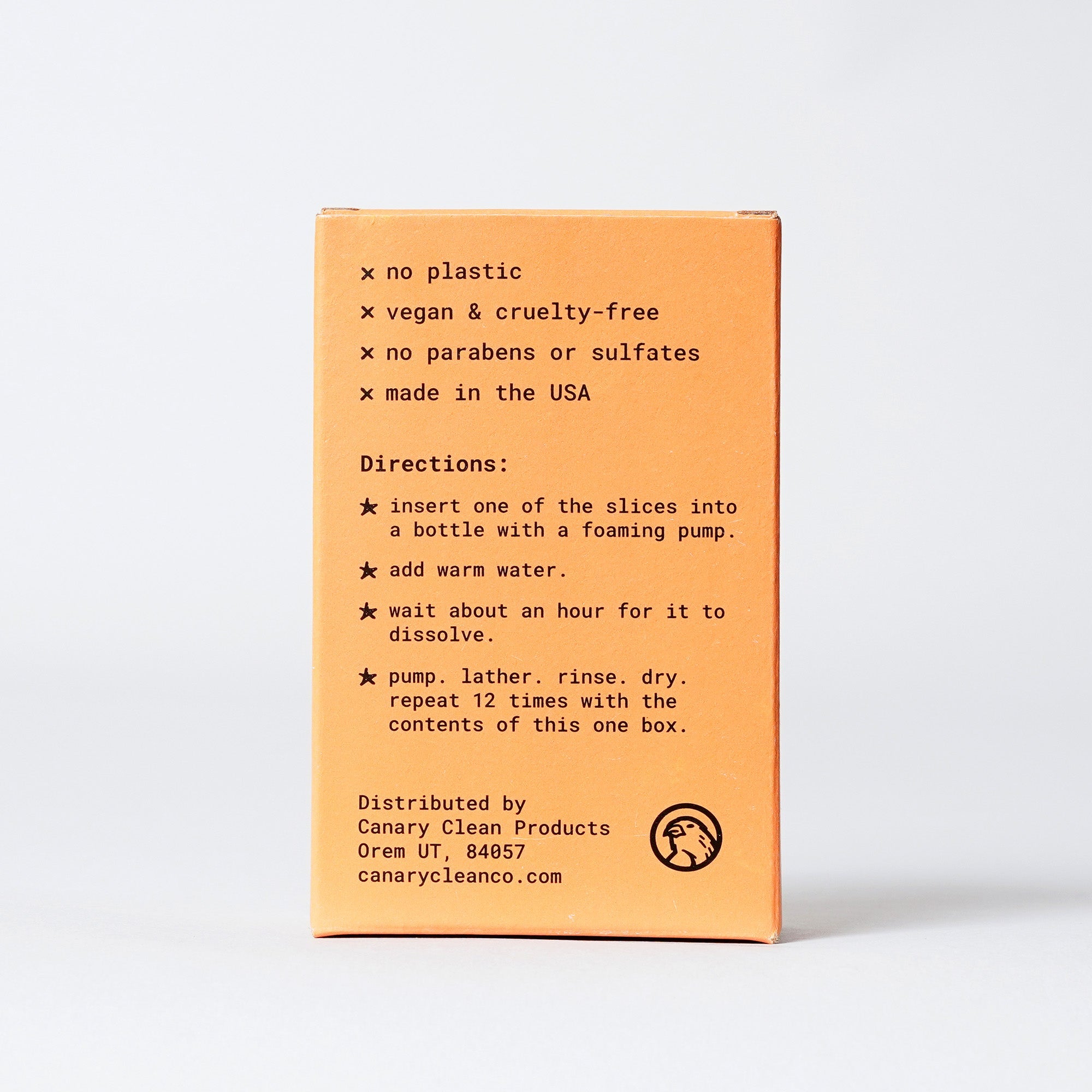 It's as simple as adding water. Just insert a slice into your foaming hand soap bottle, fill with water (warm water works best), and wait about an hour for it to dissolve. Then, pump the foaming soap into your hand, wash, and rinse.