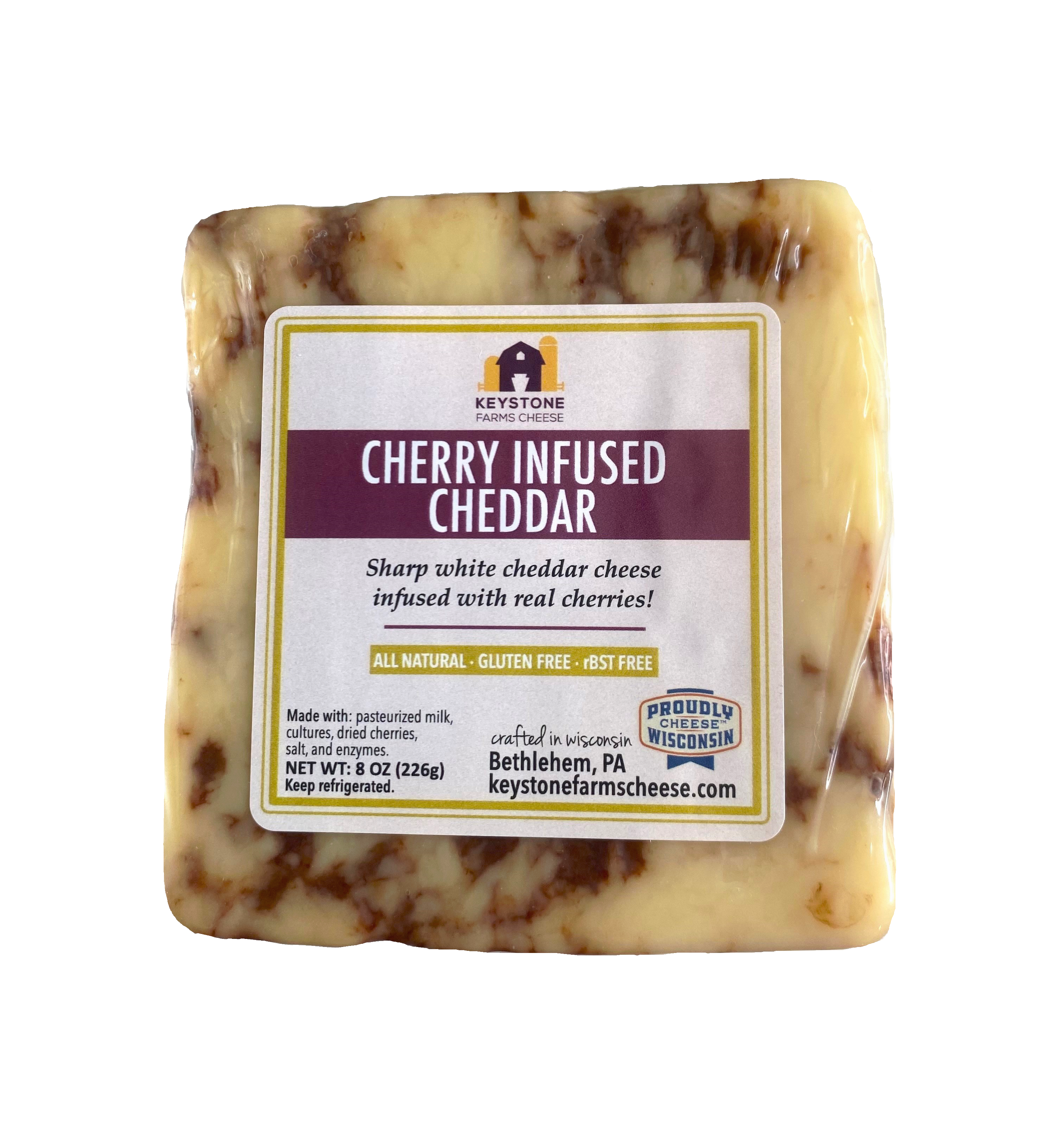 This is our mild white cheddar cheese that is infused with REAL cherries and buttery tartness of cheddar!