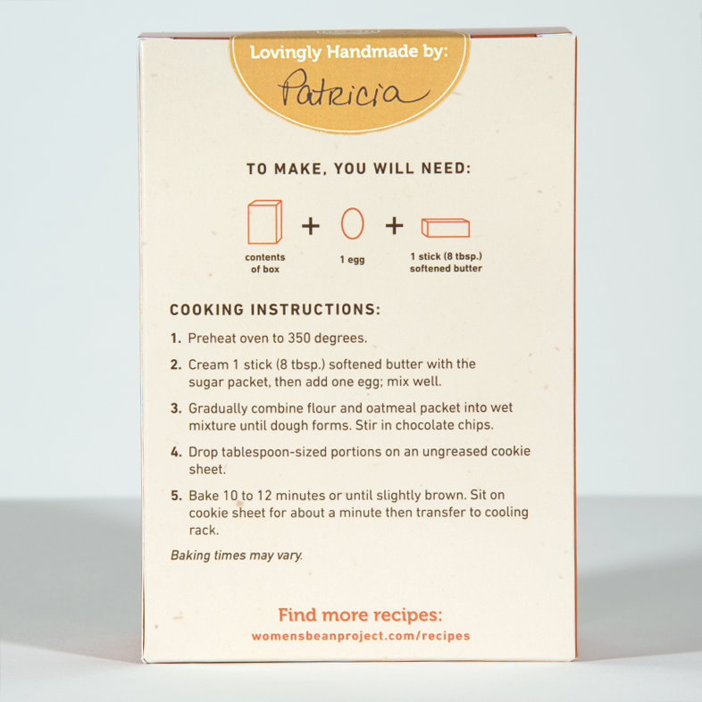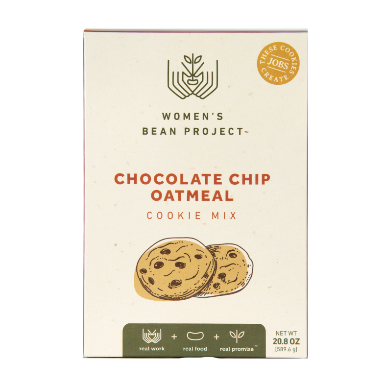 Women’s Bean Project brings you chocolate chip oatmeal cookies like no other. Our Chocolate Chip Oatmeal Cookie Mix is quick and easy to prepare and the finished product tastes just like homemade. Lovingly handmade by the women of Women’s Bean Project.