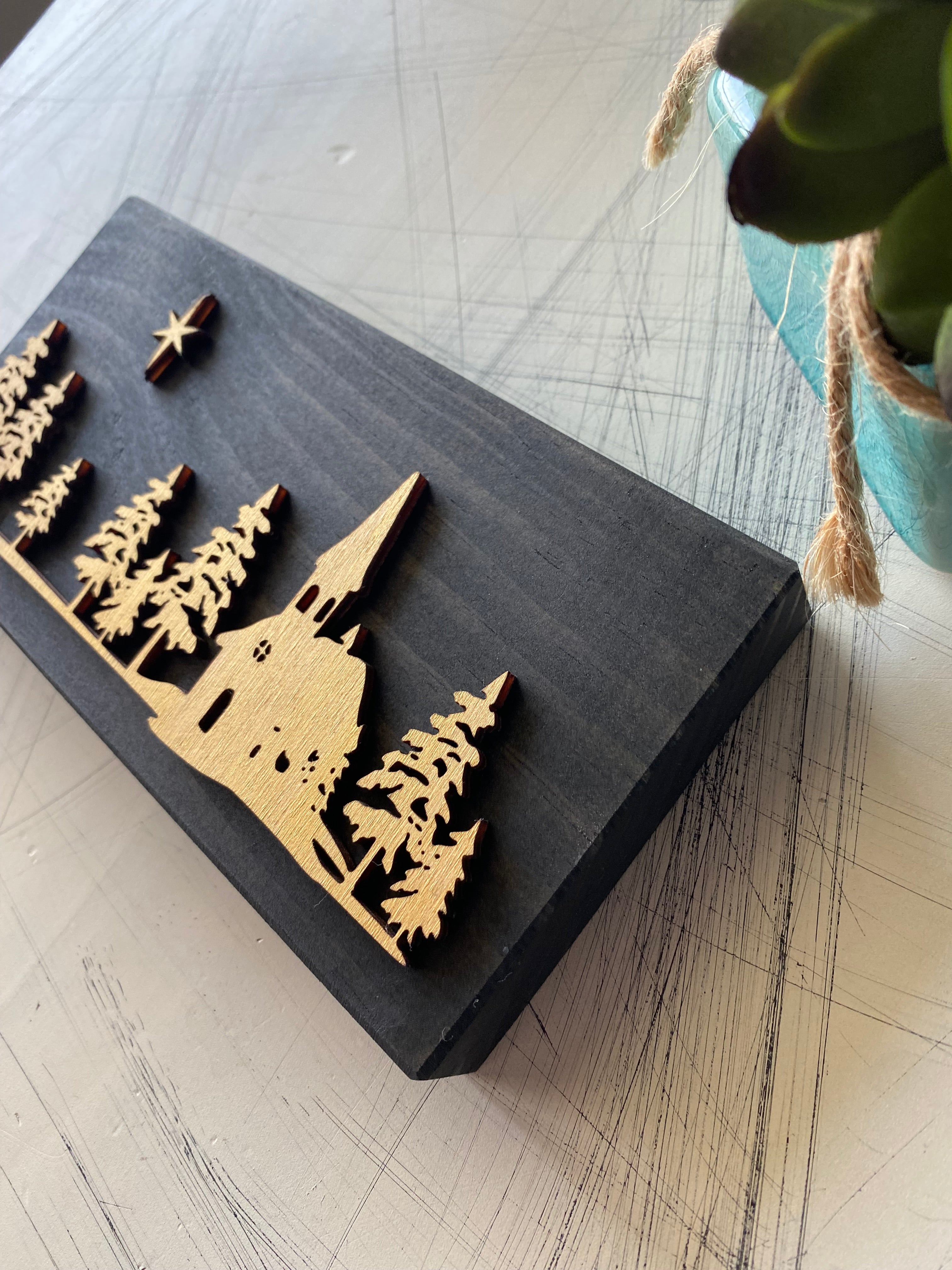 This original design is a silhouette scene of a church, evergreen trees, and a Christmas star. The handmade mini wood sign has a solid pine backdrop with a birch 3D church scene. This snowy landscape is a beautiful addition to your Christmas decor!