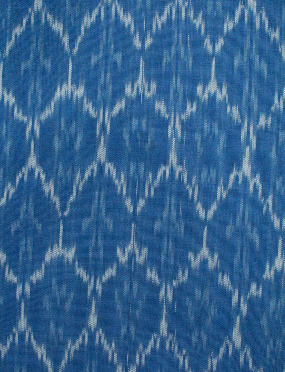 A short sleeve men's button down shirt in a cobalt blue ikat print. Gentle tapering at the waist with a straight and narrow profile and a broader fit in the shoulders gives this cobalt blue button down the perfect fit.