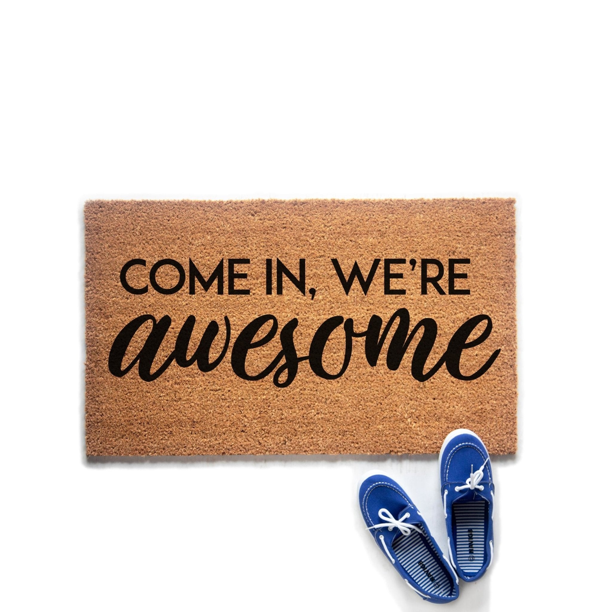 Elevate the charm of your front door with the well-crafted Come In We're Awesome outdoor coir doormat by Homebound Society. Crafted with meticulous attention to detail, our custom personalized doormats add a delightful touch to any entryway. Each mat is lovingly handpainted with UV-resistant paint and features a non-slip PVC rubber backing for enhanced stability.