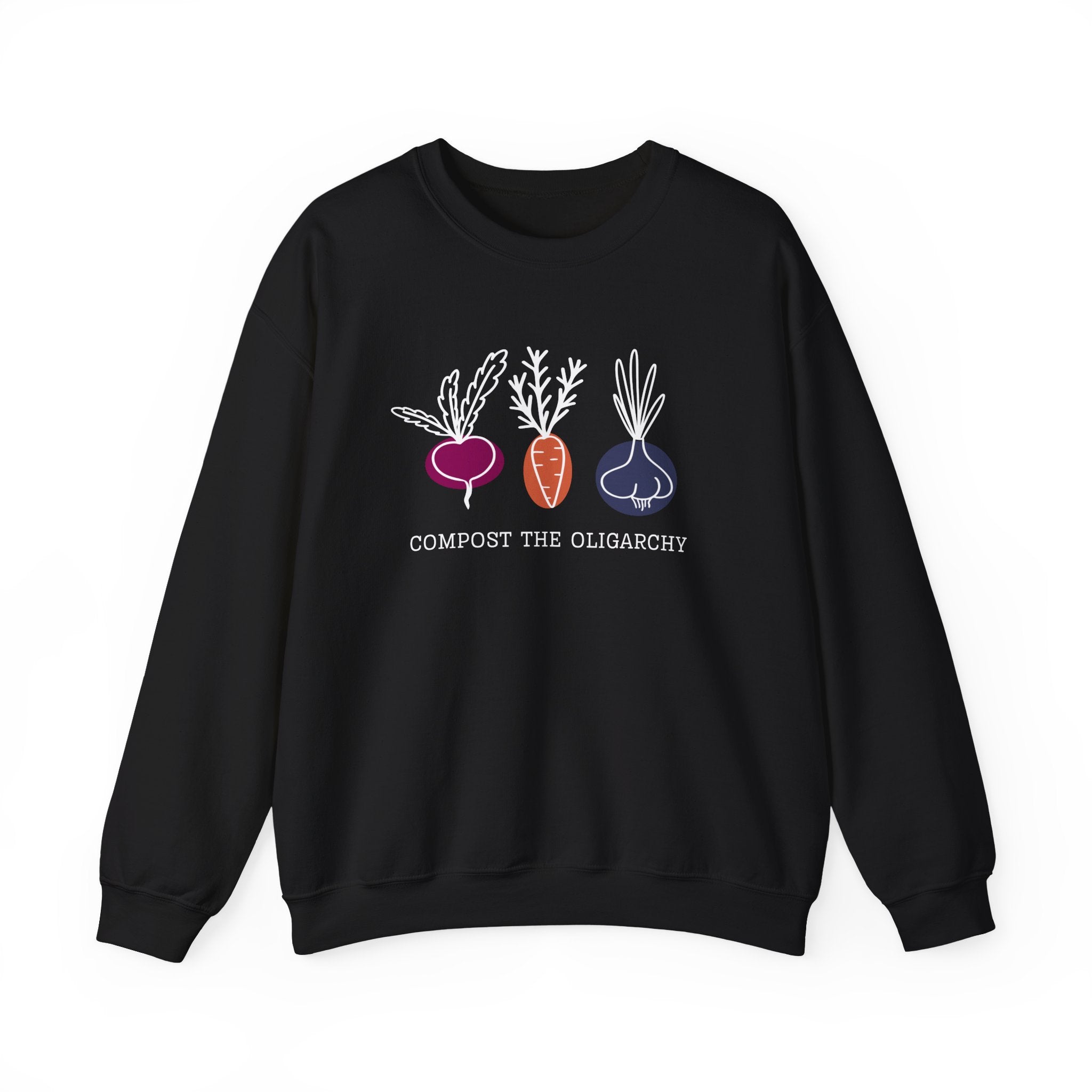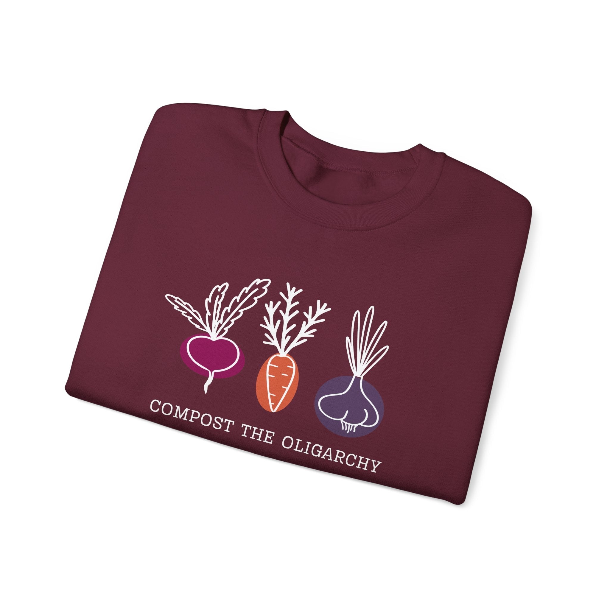 A cozy and durable sweatshirt designed for adults, featuring the bold 'Compost the Oligarchy' message embroidered on the chest. Perfect for those looking for a comfortable and stylish way to make a statement against the establishment. Ideal for fall and winter seasons, this sweatshirt is relevant for social activists and those passionate about political change.