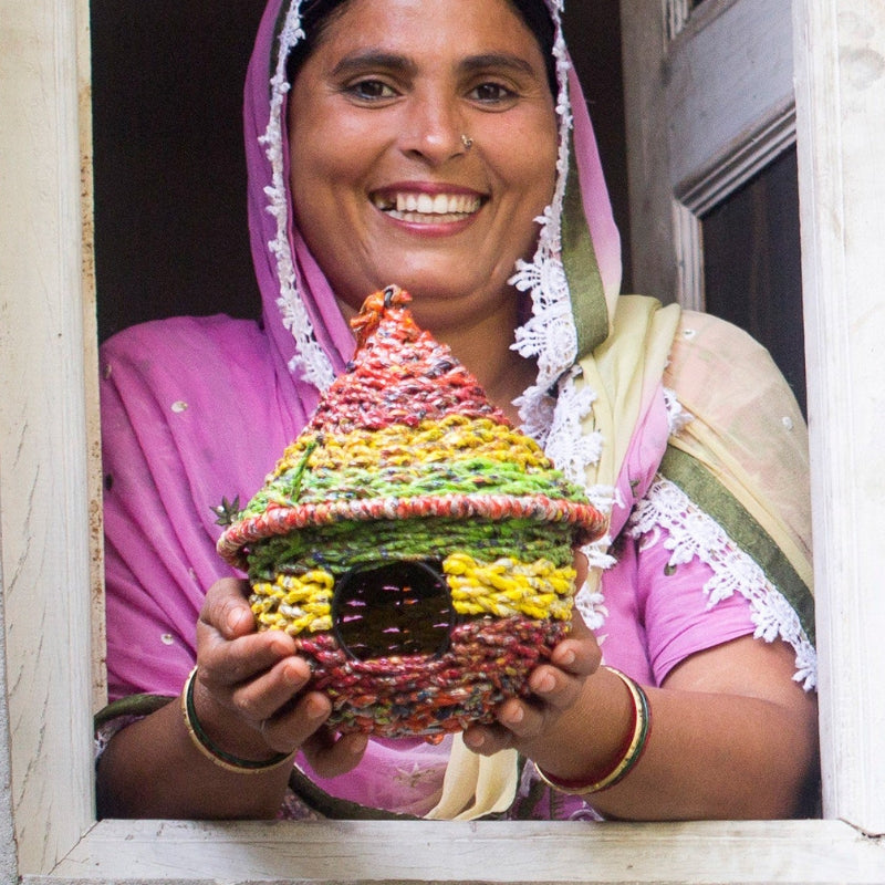 You will love both, the bright colors of this truly unique, Eco-friendly birdhouse as well as its shape. It's handcrafted from a wire frame and recycled snack wrappers. These pre-consumer factory leftovers would otherwise be discarded and added to landfills.