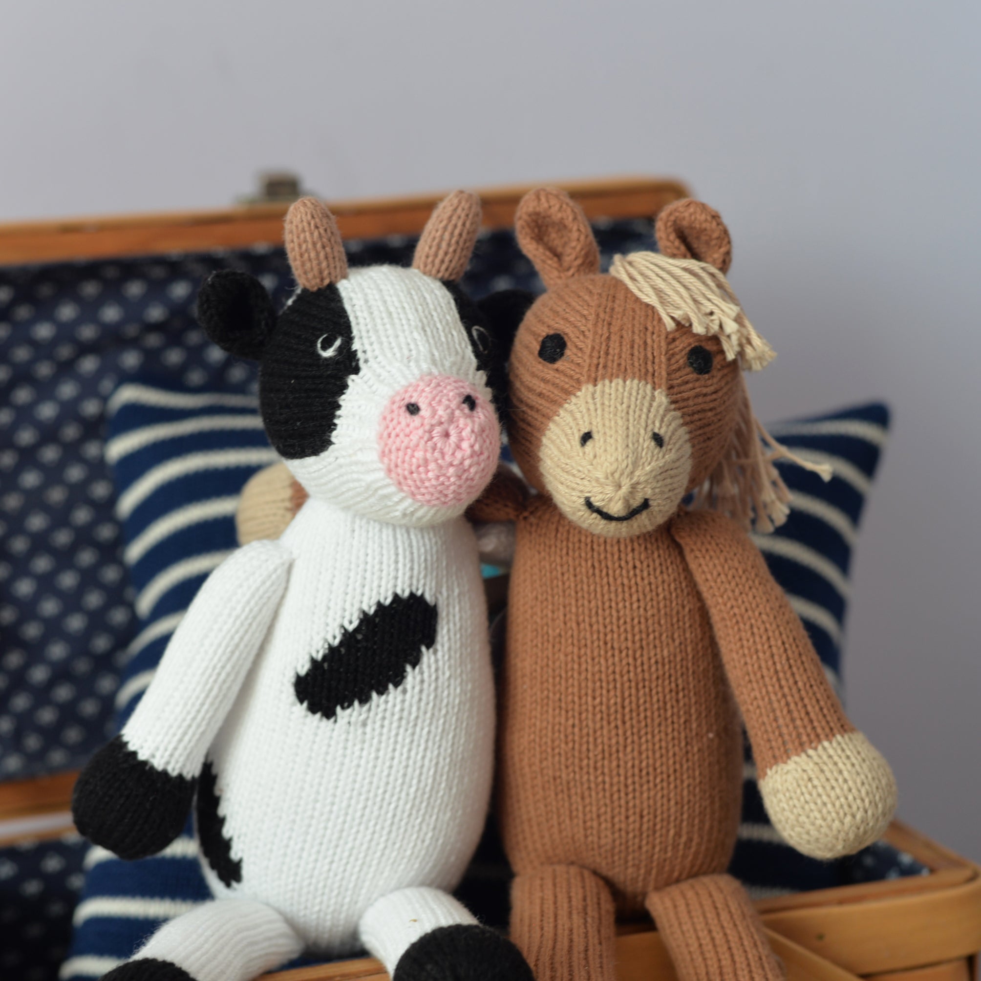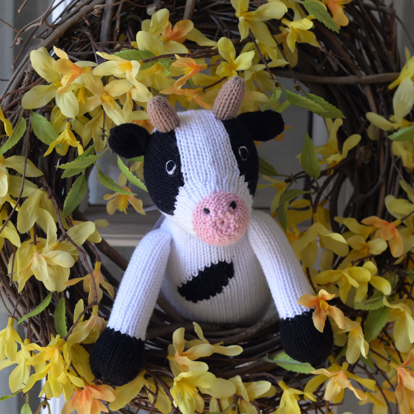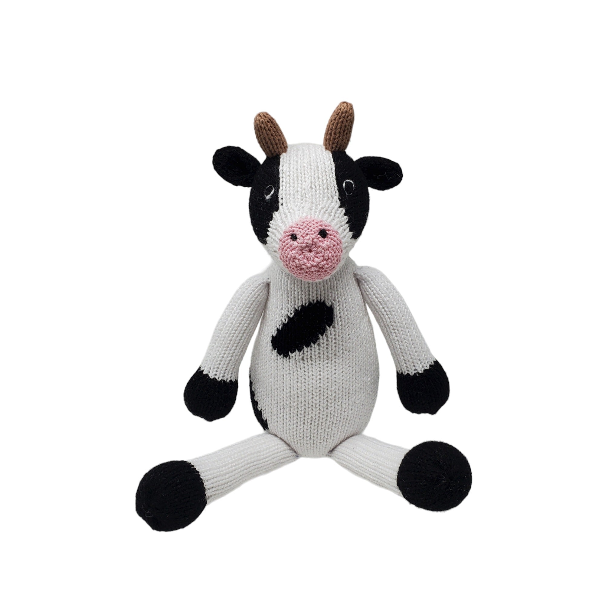 Bring some barnyard charm into your child's world. This knit cow stuffed animal serves as a endearing playmate, a reminder of the countryside, and a cozy companion for any child's imaginative adventures. With its combination of softness, visual appeal, and attention to detail, this black and white knit cow is sure to become a beloved member of the toy family.
