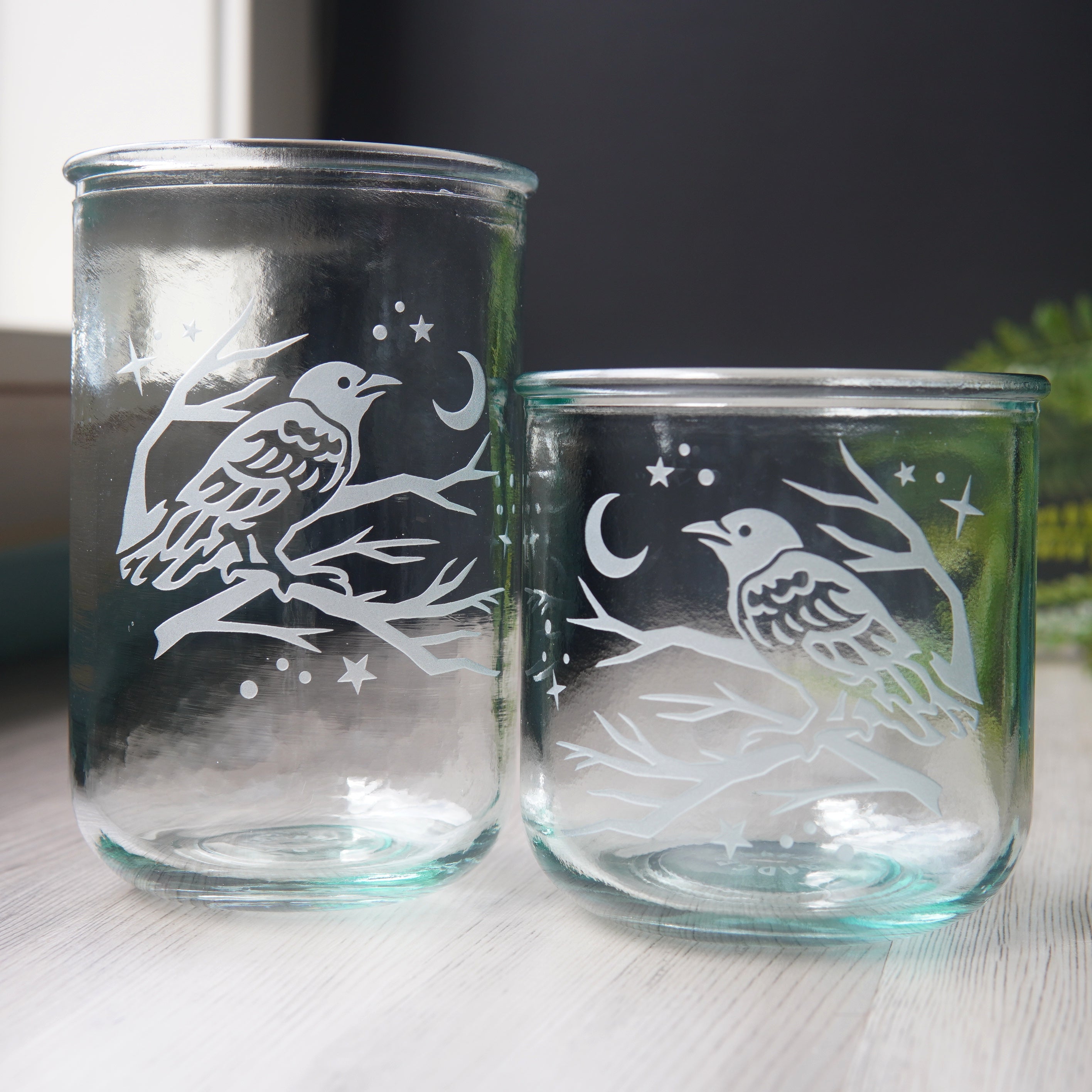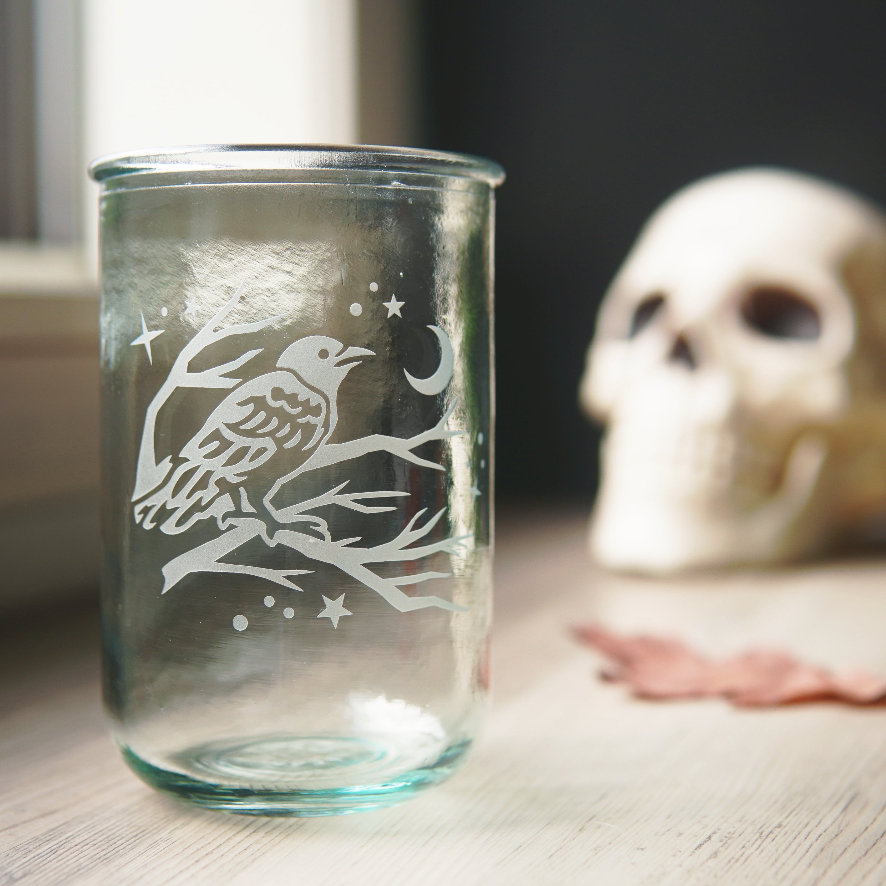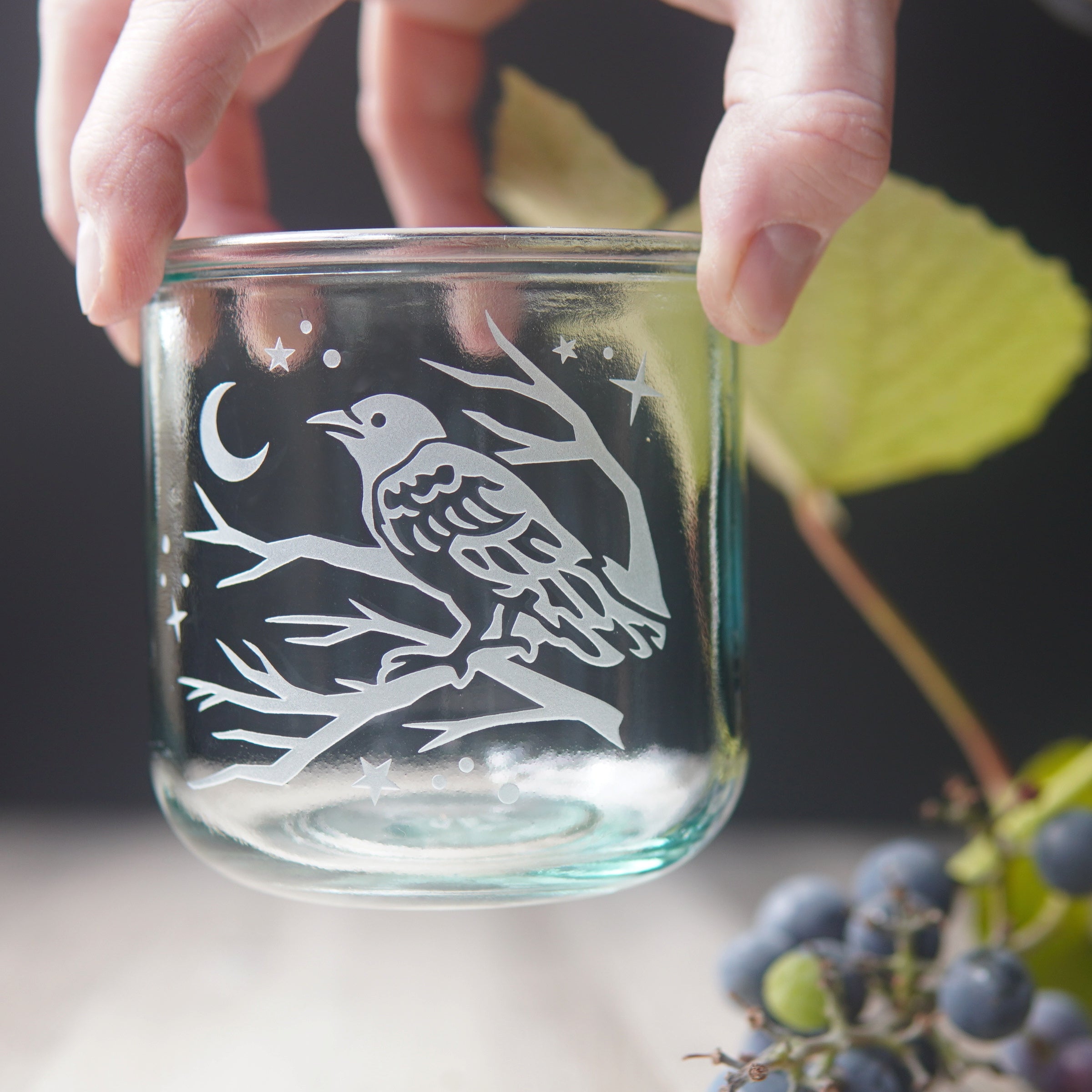 This exquisite Crow Rustic Recycled Glass Tumbler serves as a timeless symbol of death and rebirth. Crafted in Spain with 100% recycled eco-friendly glass, it features a rustic charm that is beautifully rugged. Its design showcases a majestic crow perched atop a bare tree against a deep night sky, culminating in a distinguished work of art.