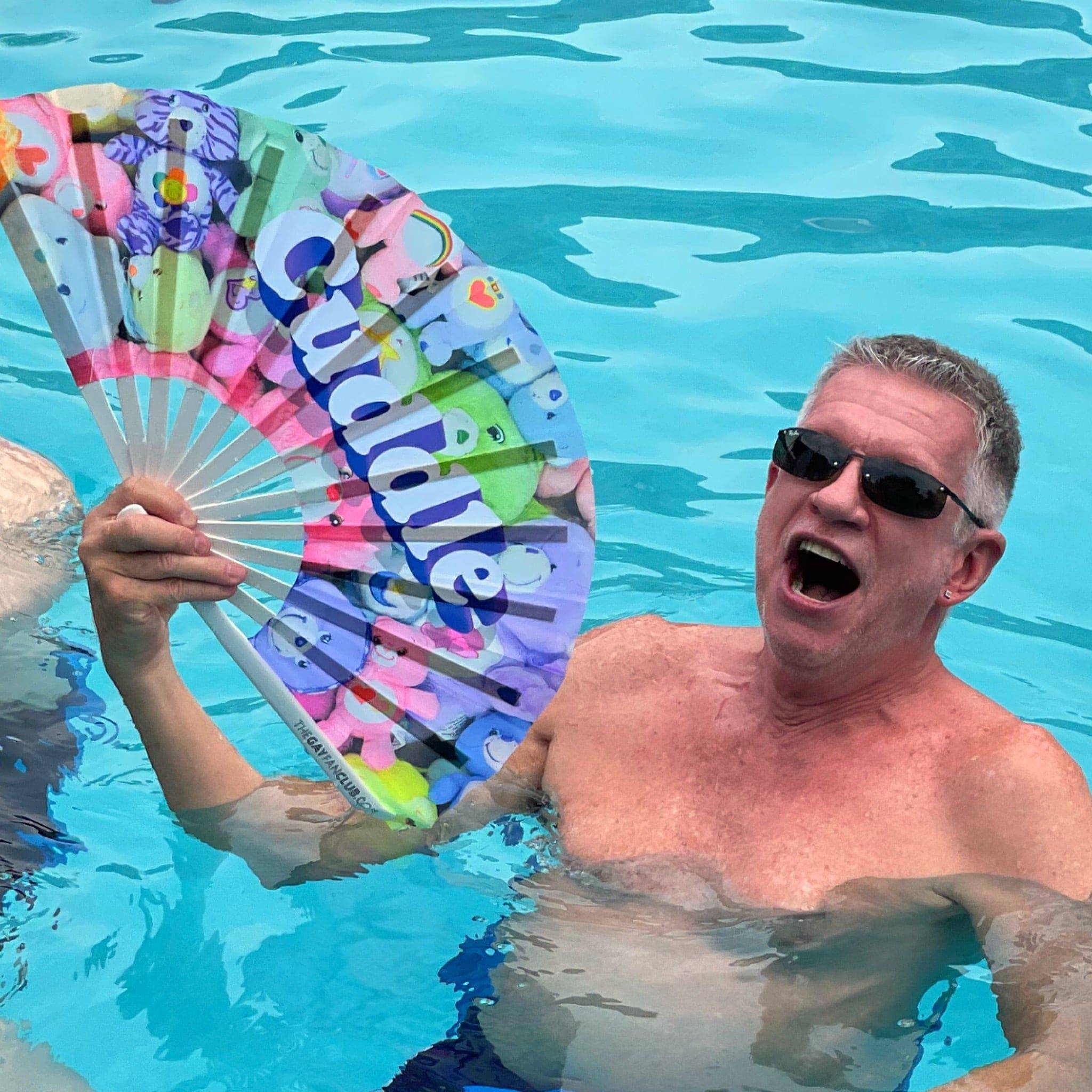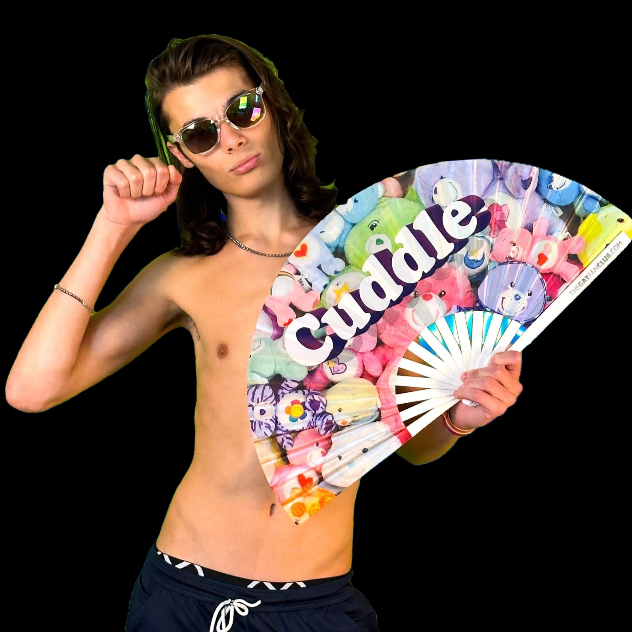 The "Cuddle Bear" Fan is a UV-reactive hand fan with a loving nod to the gay bear community. It's the perfect blend of cozy vibes and vibrant colors designed to shine brightly under blacklight.