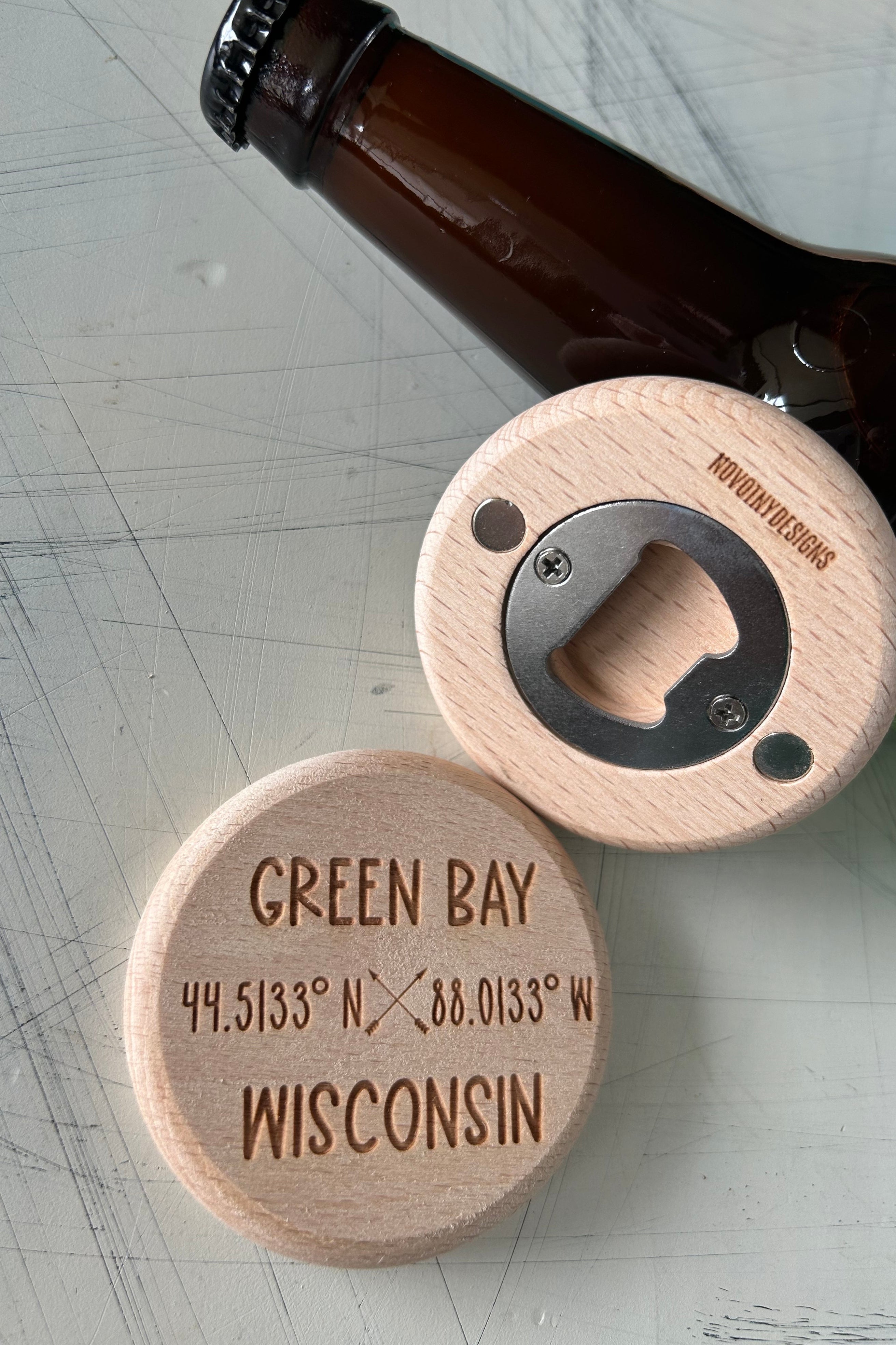 Round bottle opener is engraved beechwood with magnets and metal bottle opener on the reverse. Bottle opener measures 2.5” wide and 0.39” thick.