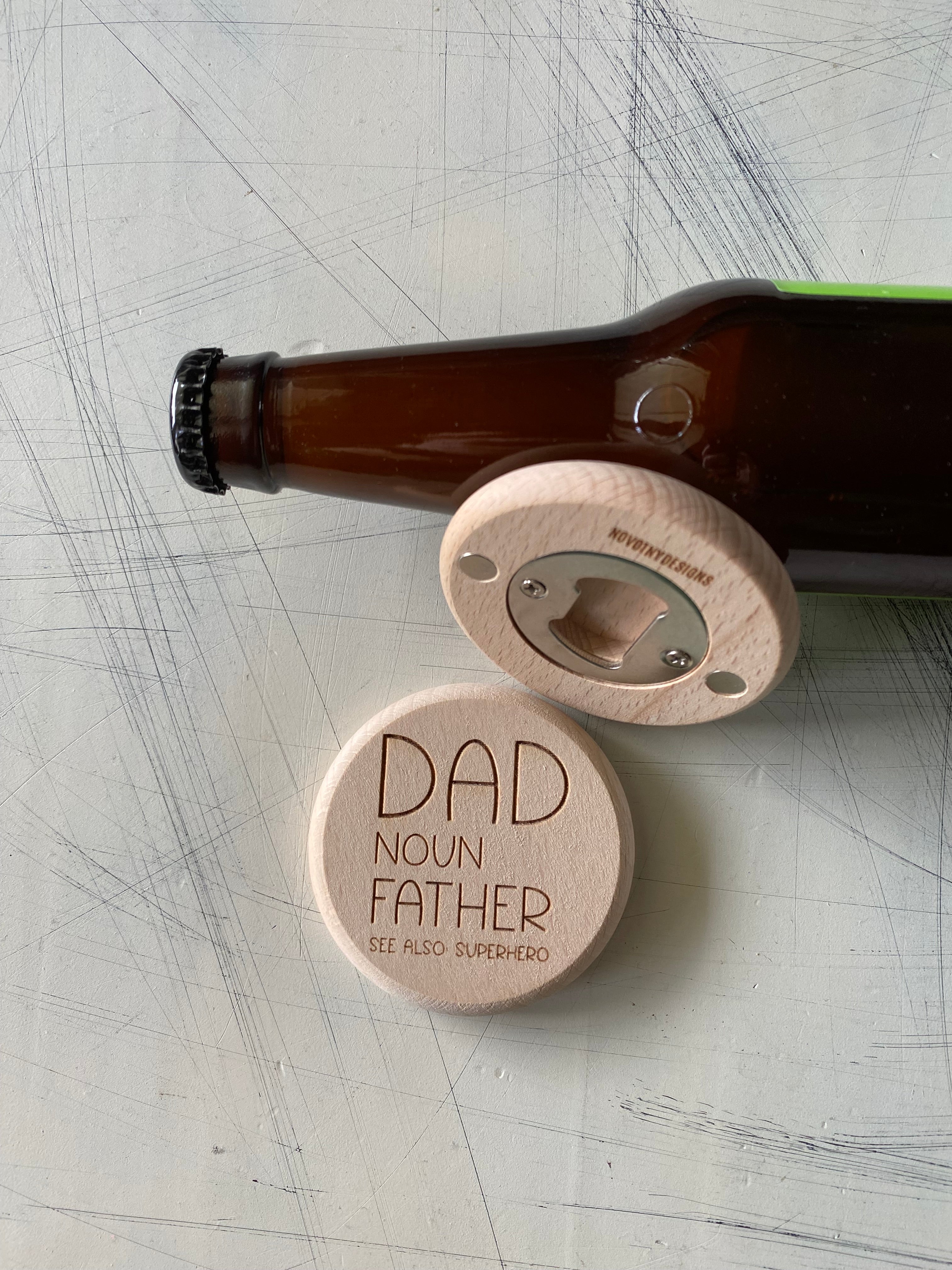 Dad. Noun. Father. See also: superhero - magnetic wood bottle opener