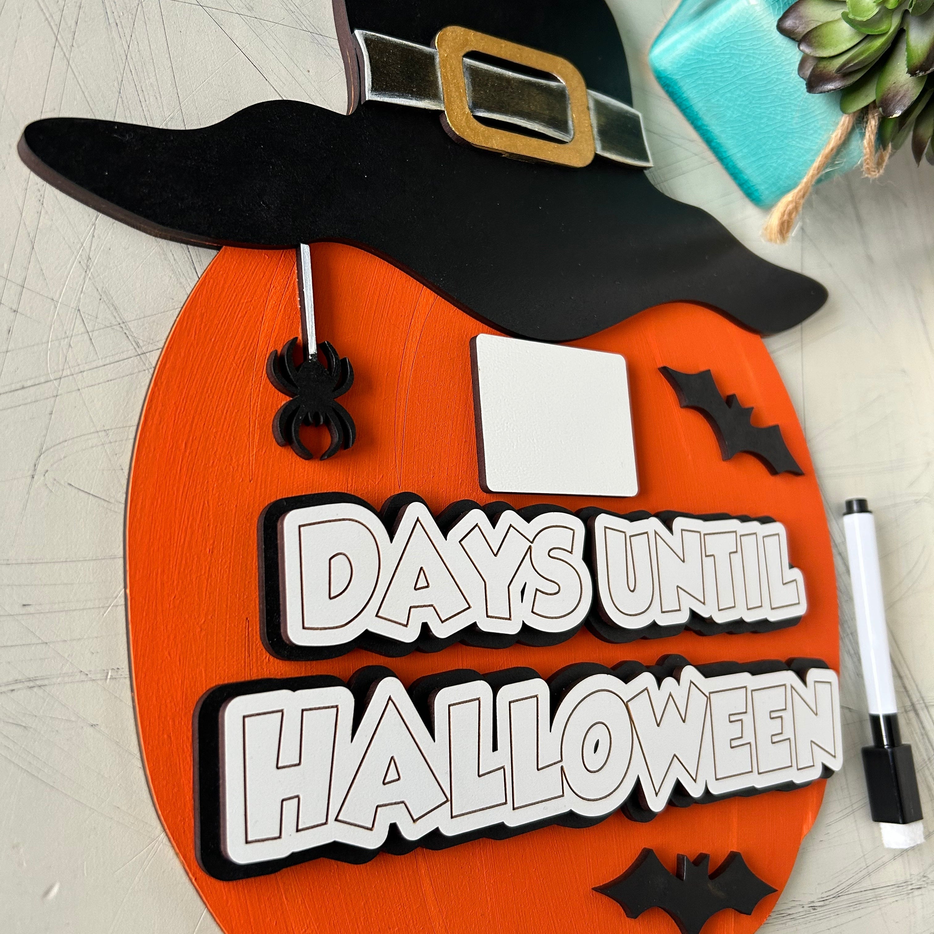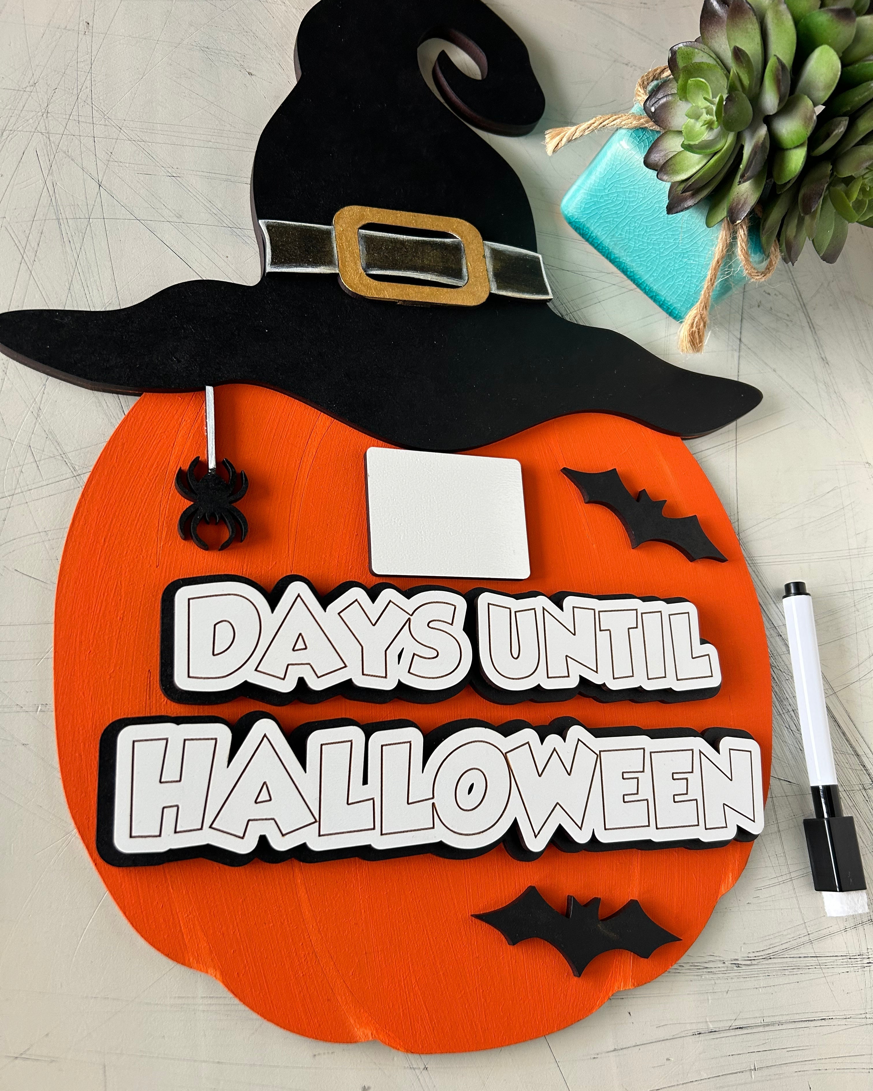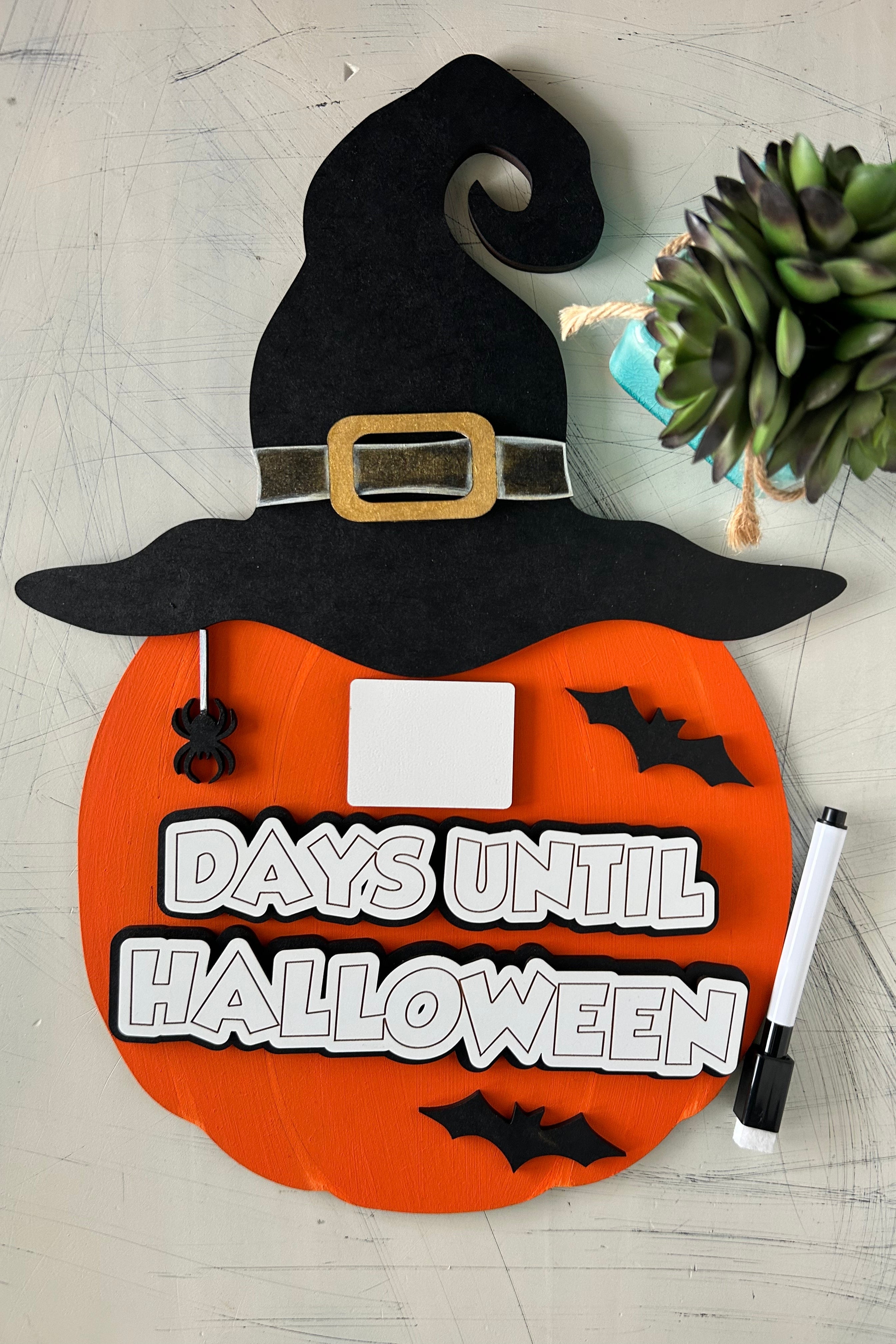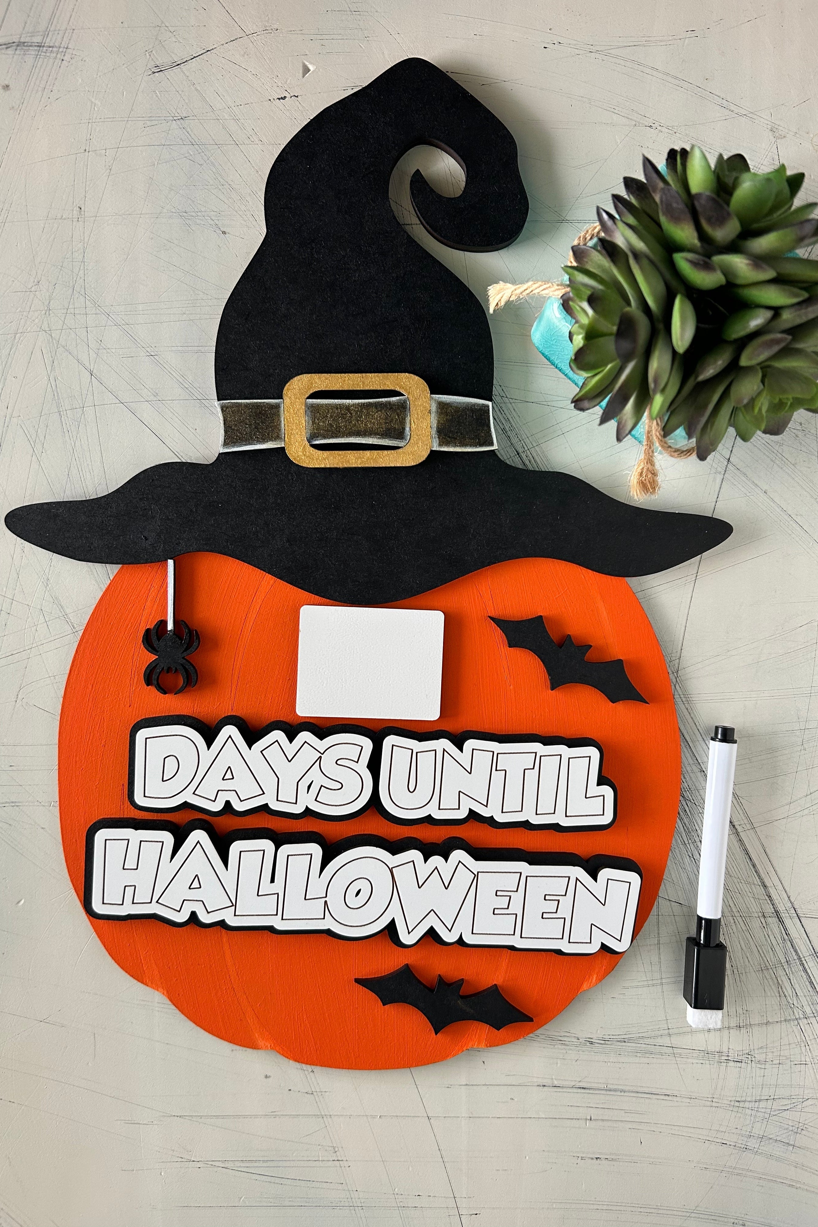 Handpainted MDF sign with a built-in hanger on the reverse to easily display on a wall, or simply lean on a shelf or desk top for display. Dry erase marker included. This Halloween countdown calendar sign measures 10.75 inches wide x 15 inches tall.
