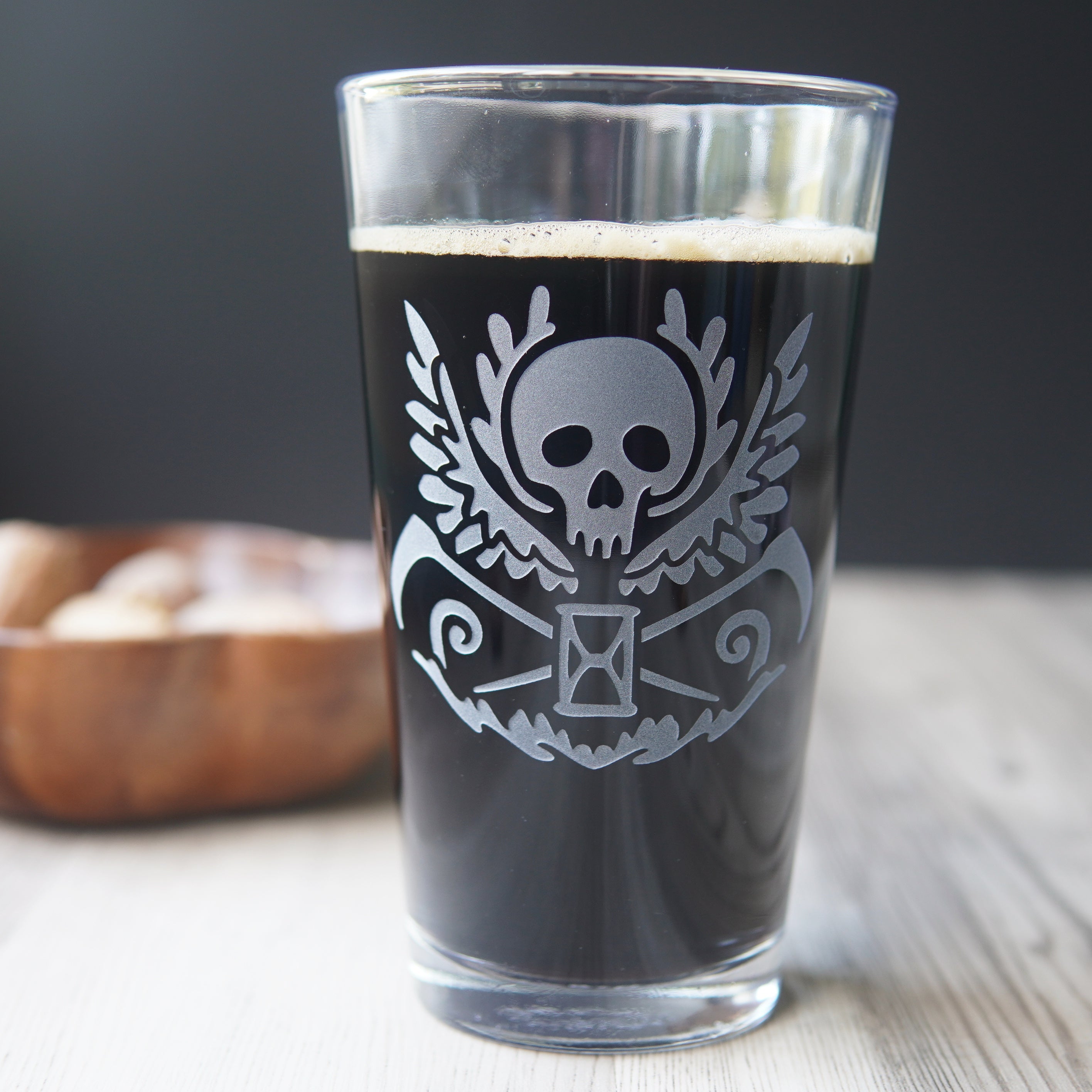 Raise a pint to mortality with this special Death Skull Pint Glass! Crafted as an etched glassware inspired by the symbols of the Chapel of Bones in Portugal, this glass features a scythe to signify the Reaper's touch, a winged skull for a toast to the afterlife, and an hourglass to remind us that our time is limited.
