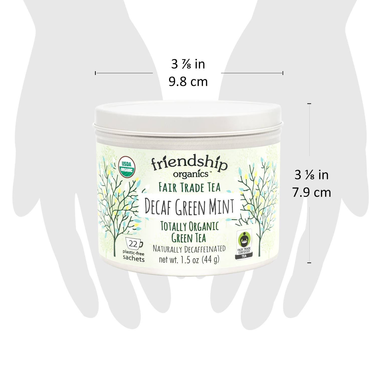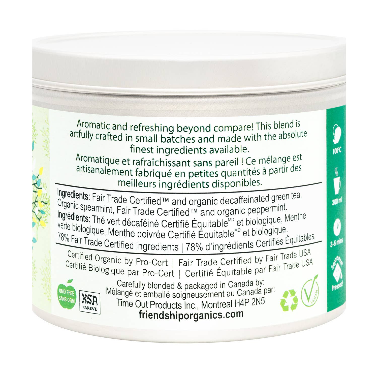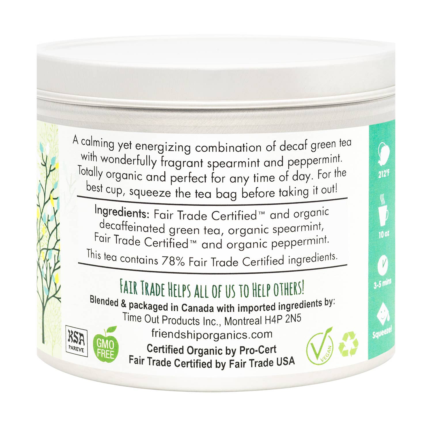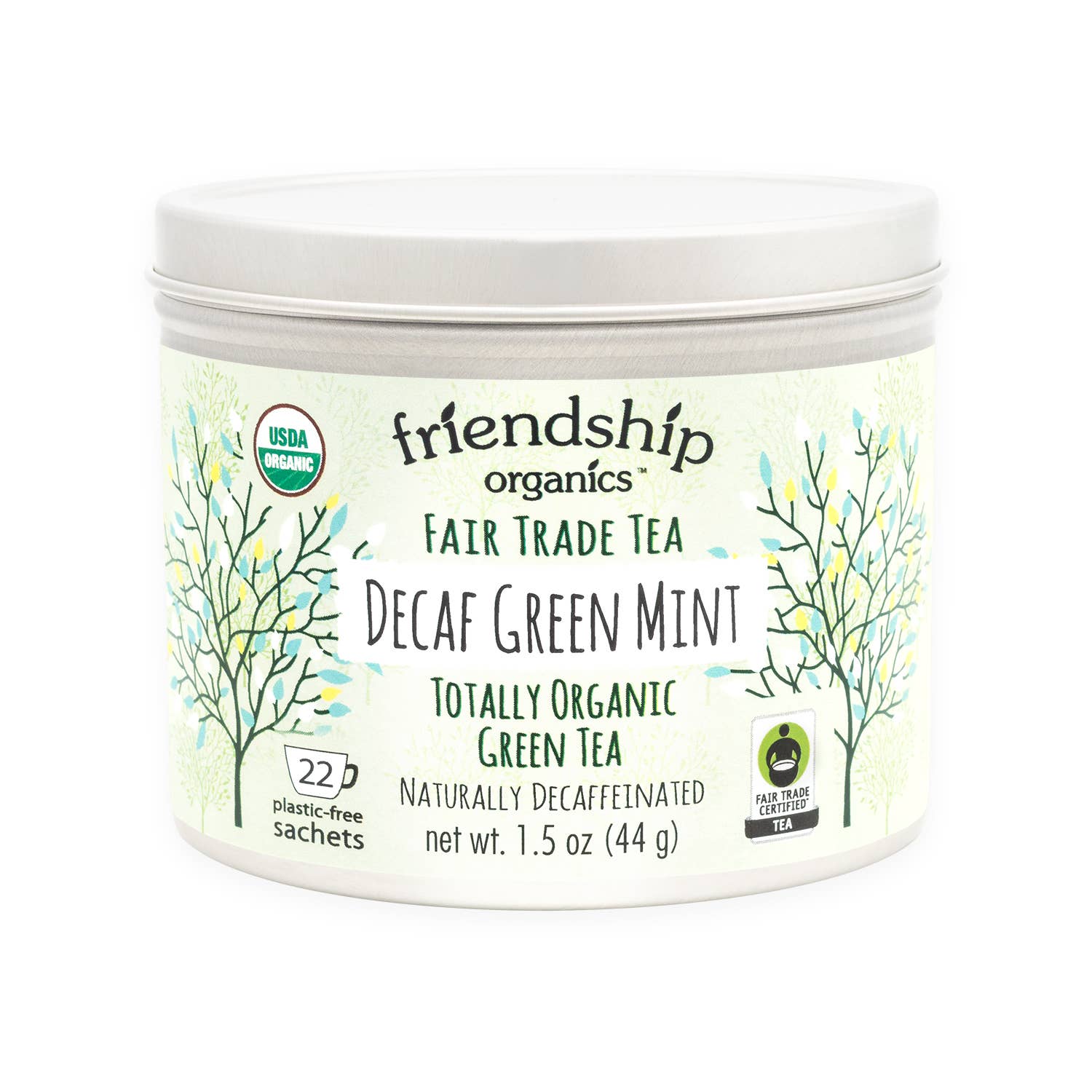 Fragrant and relaxing, our Decaf Green Mint tea is the perfect blend of organically grown green tea (always CO2 decaffeinated) and our amazing spearmint and peppermint leaves. It's perfect any time of the day, calming yet energizing. Squeeze the tea bag to get all of the flavor into your cup! Packed in a plastic-free cellophane bag, our tea sachets are made from natural abacá fiber and are themselves plastic-free. Our Tin can be reused countless times and is totally recyclable. Organic Certified, Fair Trade Certified and Kosher certified. All ingredients are non-GMO certified, cultivated without the use of pesticides, and naturally Gluten-free.