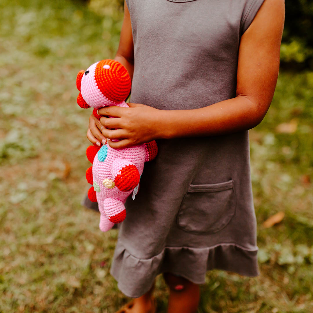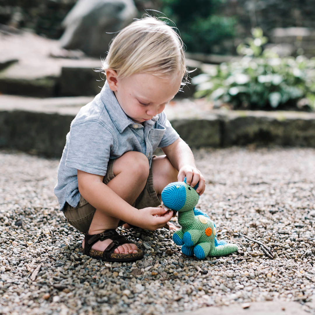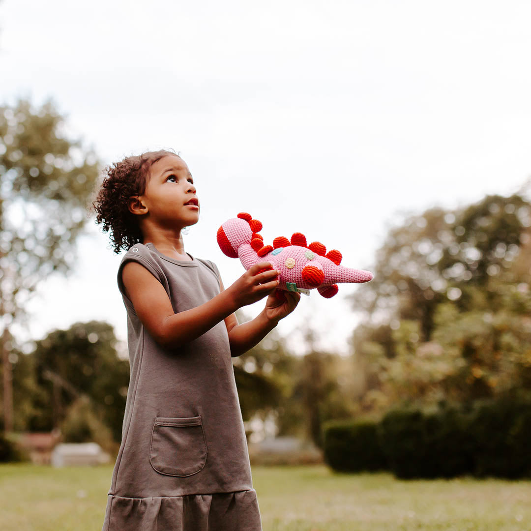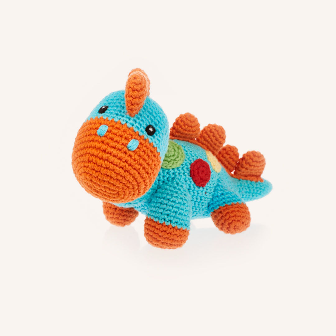 Let your child's imagination wander back to prehistoric times with this darling stegosaurus dinosaur plush toy. Featuring delicate little stitched details, this charming stuffed animal is handmade with soft cotton yarn and makes a gentle jingle while playing. This baby toy adds a pop of color to the nursery and is a perfect gift for baby showers. Designed to last, this toy is treasured by many toddlers and older children as well.