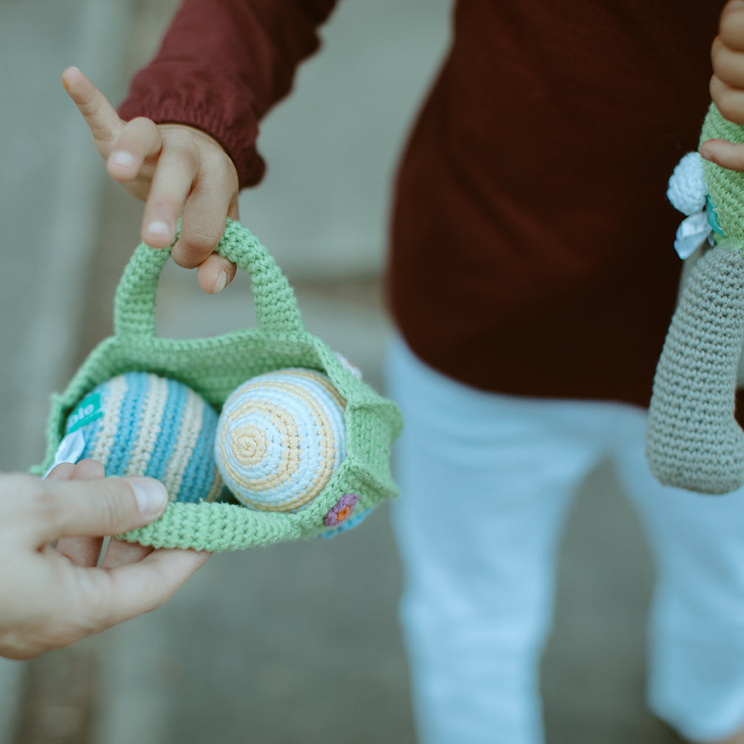 When you want to give a gift that lasts long after the candy has been eaten, choose Pebble Easter Eggs. Crocheted with buttery soft cotton yarn, these plush eggs are similar in size to actual eggs. Two will fit nicely into our Yellow or Green Chick Baskets.