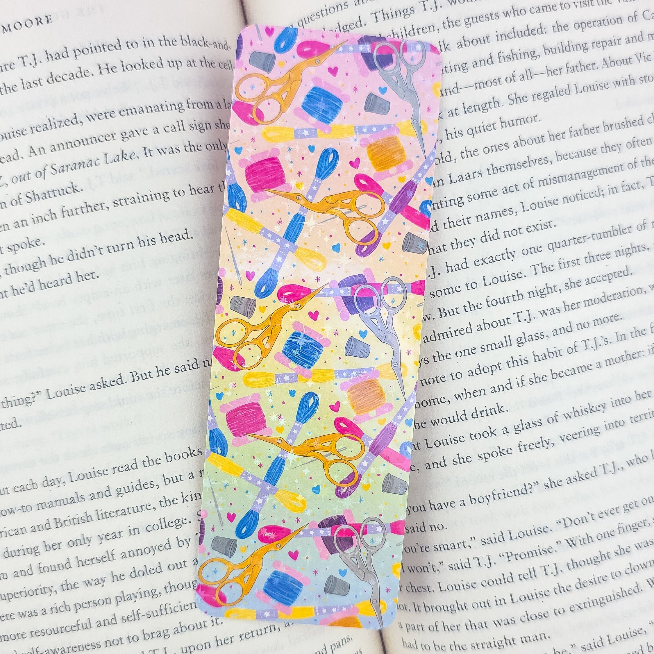 Celebrate your love of crafting and reading with this embroidery-themed holographic bookmark! Featuring a vibrant pattern of stork embroidery scissors, thimbles, floss skeins, bobbins, and needles, this laminated bookmark shines with a holographic finish. Each one is cut, corner-rounded, and laminated by hand for durability and charm.