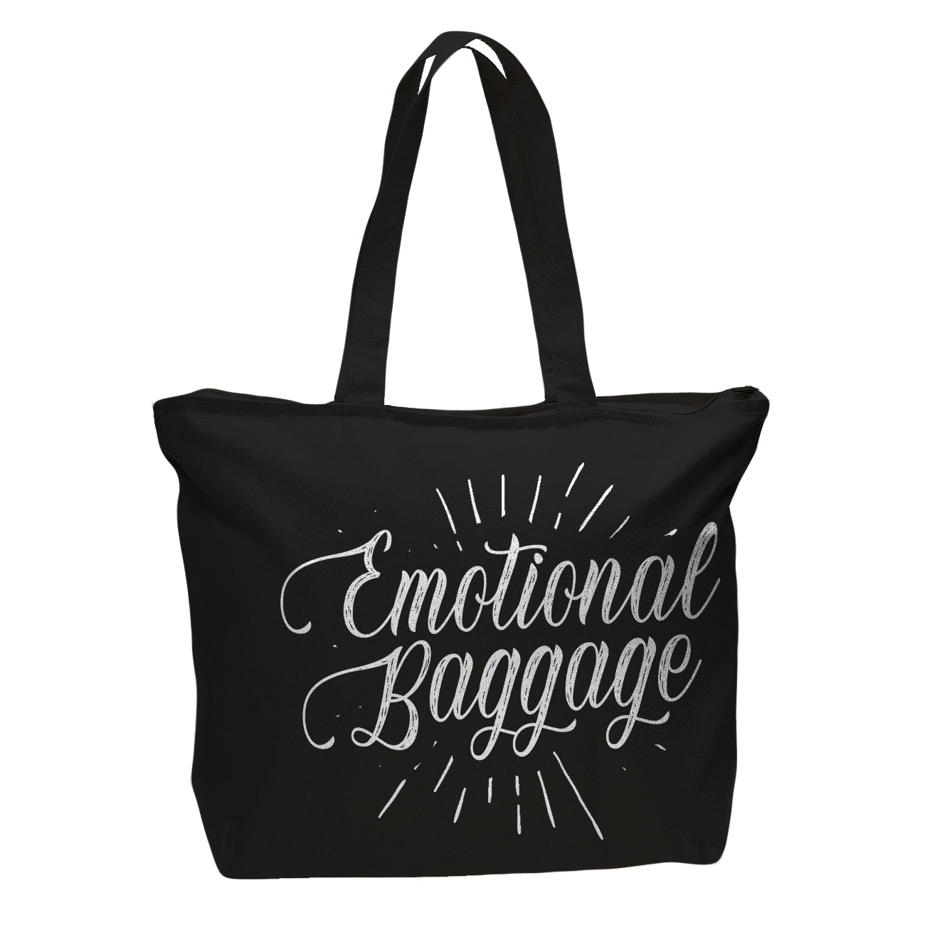 Made from 12oz. soft and sturdy cotton canvas. Measures approximately 20 inches wide, 15 inches tall, and with a 5 inch bottom gusset for ample storage capacity. The handles are about 23 inches long making for a 10 inch drop. It has a zipper on the main compartment as well as a small zippered interior pocket for small valuables.
