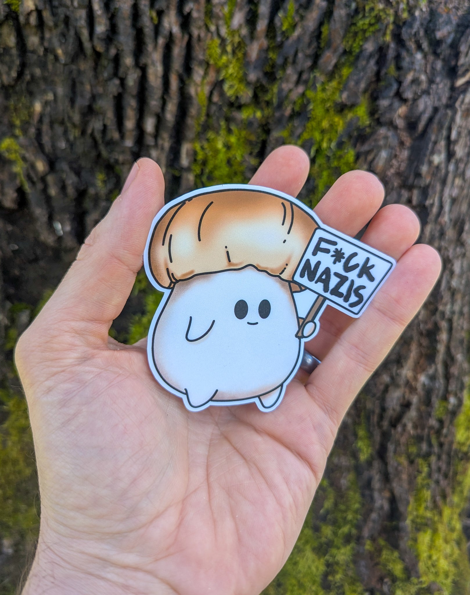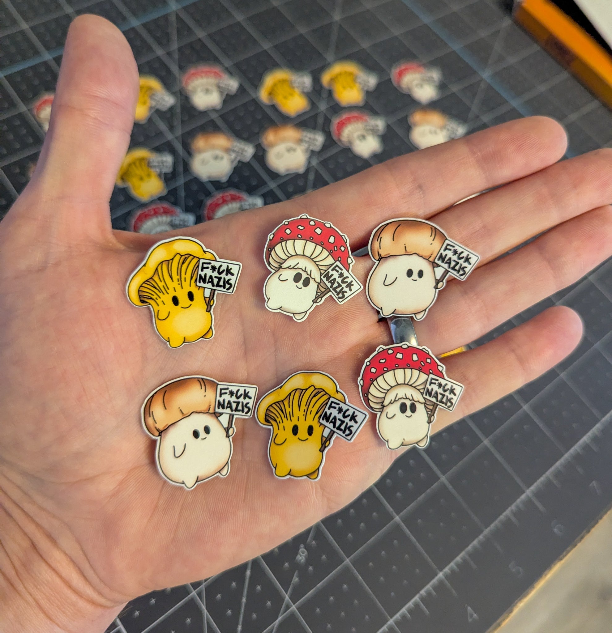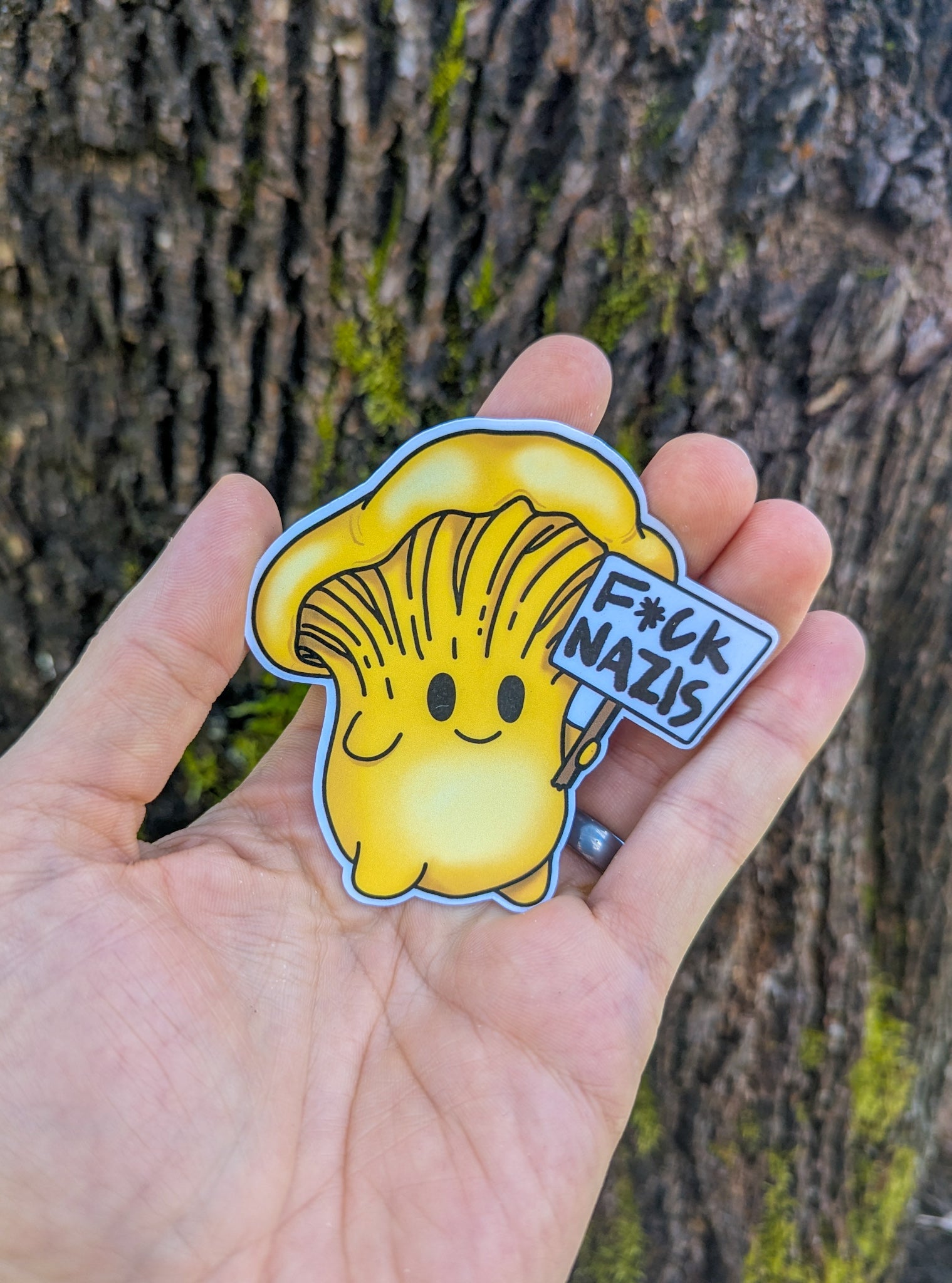 "F*ck Nazis" Mushroom Sticker Trio (censored) | Chanterelle, Amanita and Porcini Mushrooms Holding Picket Signs