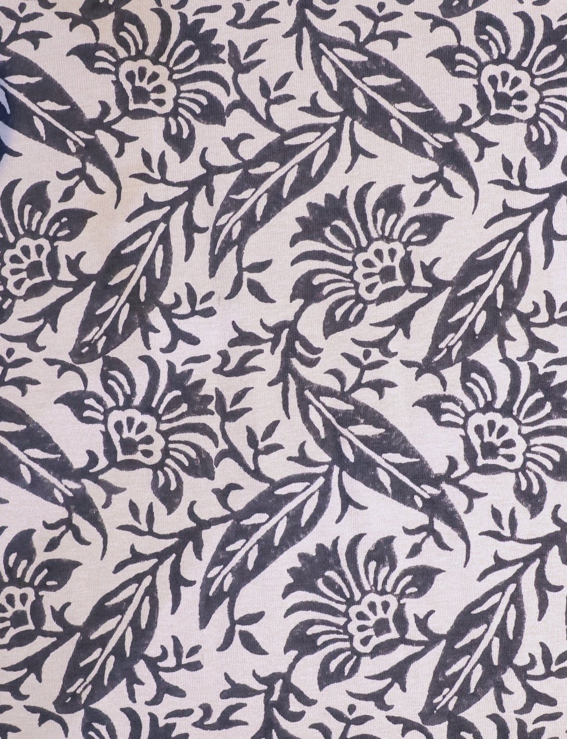 Our Fall Shadows Organic Dress is the perfect way to wear florals for fall and winter. This soft grey and black dress is hand block printed with organic dyes. The relaxed silhouette with a v-neck and short sleeves flatters all body types and layers perfectly under a cardigan for cooler fall days.