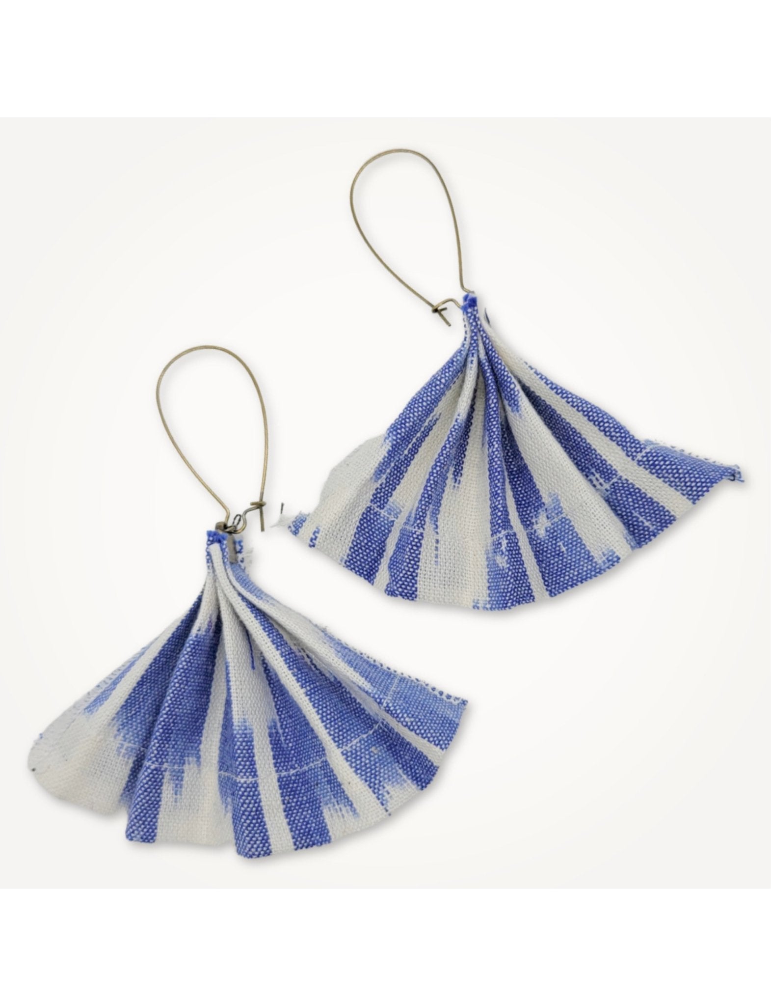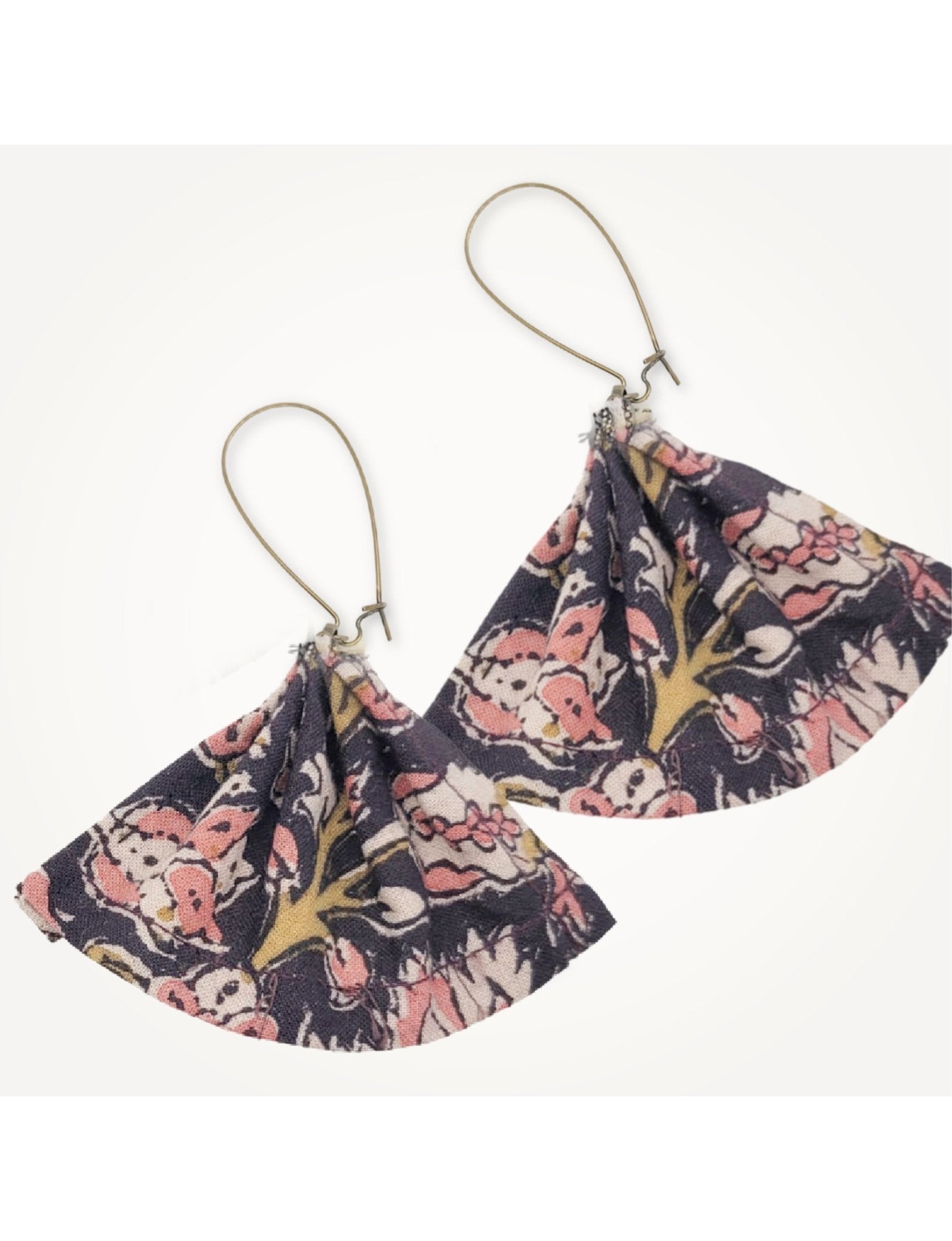 A zero-waste collaboration with local New Orleans jewelry designer Beatrix Bell. These light-weight fan earrings are sustainably made with repurposed production fabrics. Each piece is handmade, so patterns may vary slightly.