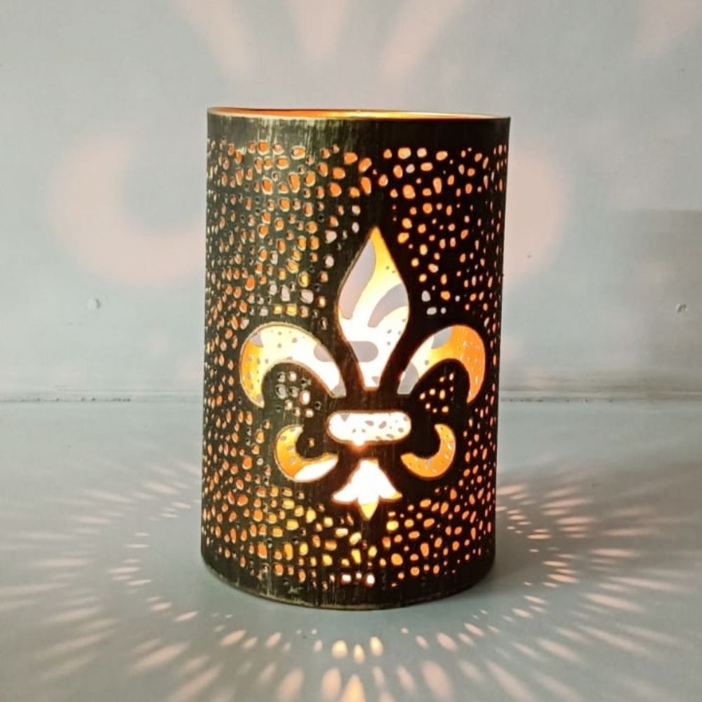 EXCLUSIVELY OURS! The iconic Fleur de Lis shines warmly through the intricate openwork pattern of this copper-plated candle holder. For use with LED tea light (not included).