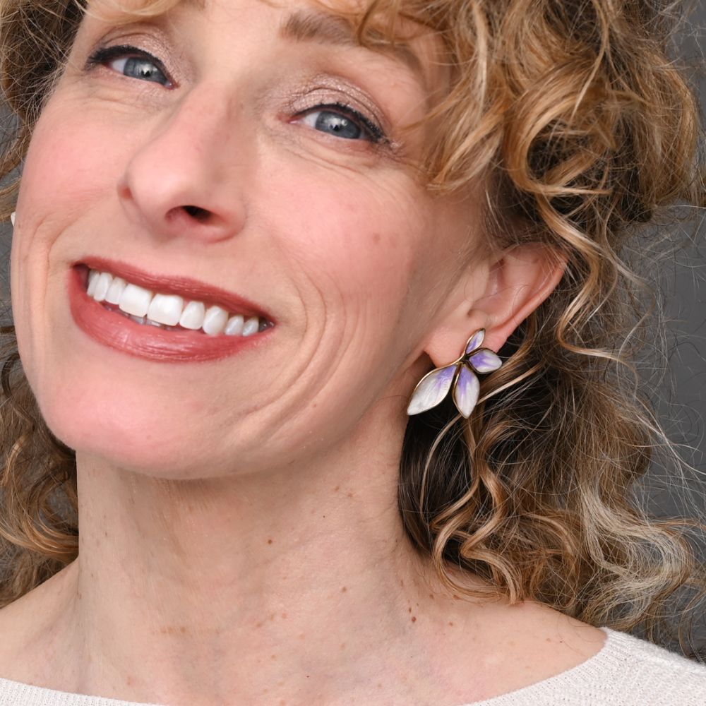 Our Flourish Earrings feature modern, stylized petals painted in glittering lavender enamel and framed in radiant 14K gold plating. Their artful design brings a fresh, elegant touch to any look—wear them with a flowing dress for effortless grace or let them add a pop of color to your everyday style.