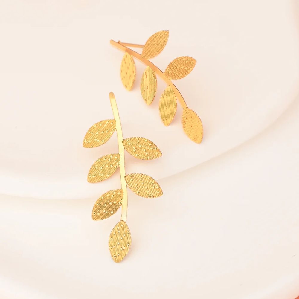 Our Vine Leaf Post Earrings are a radiant symbol of transformation and growth. Each vine of leaves is crafted in 14K plated gold hammered to create texture and one-of-a-kind beauty that embodies strength and resilience. The delicate leaf design symbolizes new beginnings and the beauty of embracing change. With each wear, may they remind you of your strength and ability to overcome obstacles.