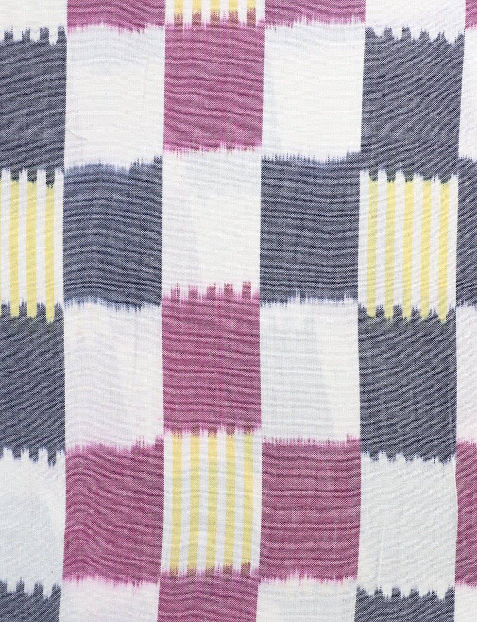 Hot off the rack, this is what dress dreams are made of. Made from ikat woven cotton, the rich colors of magenta, blue, white and yellow come together in a pattern of plaid to complete the look for this contemporary mid-length plaid wrap dress complete with a collar and front pockets!