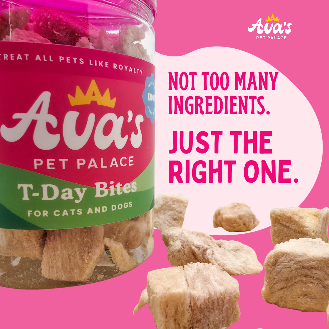 Every day is a celebration with T-Day Bites! Made with 100% freeze-dried turkey breast, these high-protein, low-fat treats are the perfect pick for dogs and cats who crave meaty flavor without the extras. With just one ingredient and nothing to hide, they’re gentle on sensitive stomachs, ideal for training, and totally irresistible.