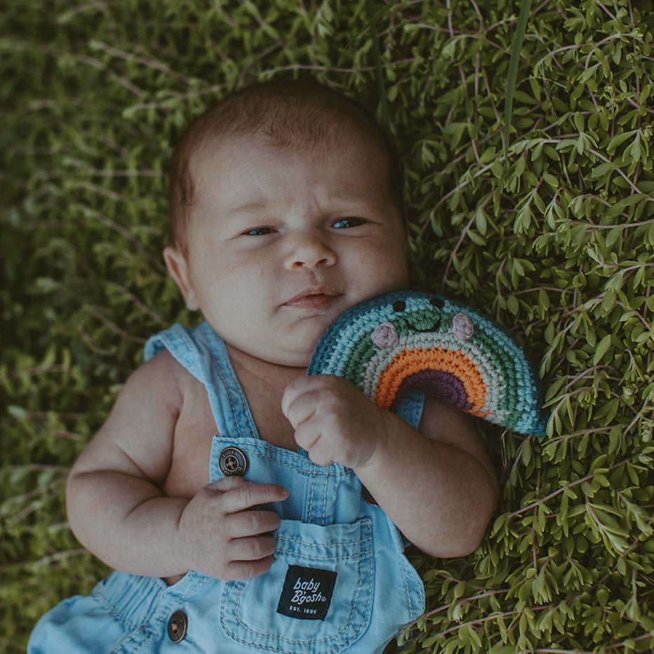 This brightly colored rainbow rattle is always smiling. No matter the weather outside, it is sure to brighten up the day. Handmade with soft cotton yarn, the rattle inside this baby toy makes a gentle sound when shaken, making it perfect for hours of pretend play.