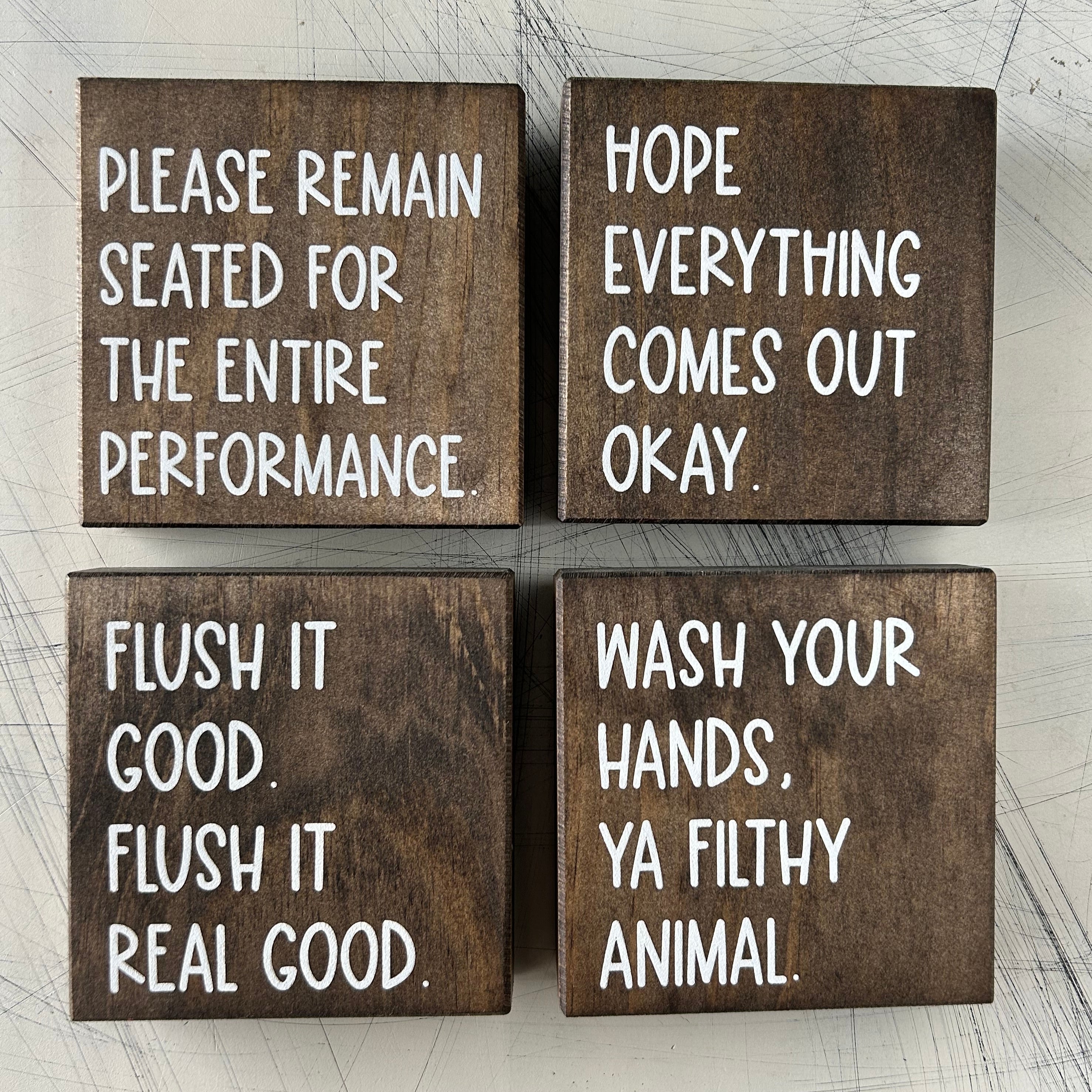 Bring laughter to your bathroom with this playful set of four handmade wood signs. Each sign features a series of witty messages to entertain your guests. Add a fun, personalized touch to your decor and make every visit a little more enjoyable!