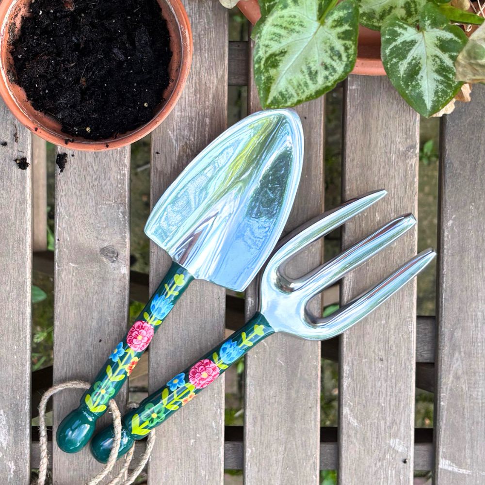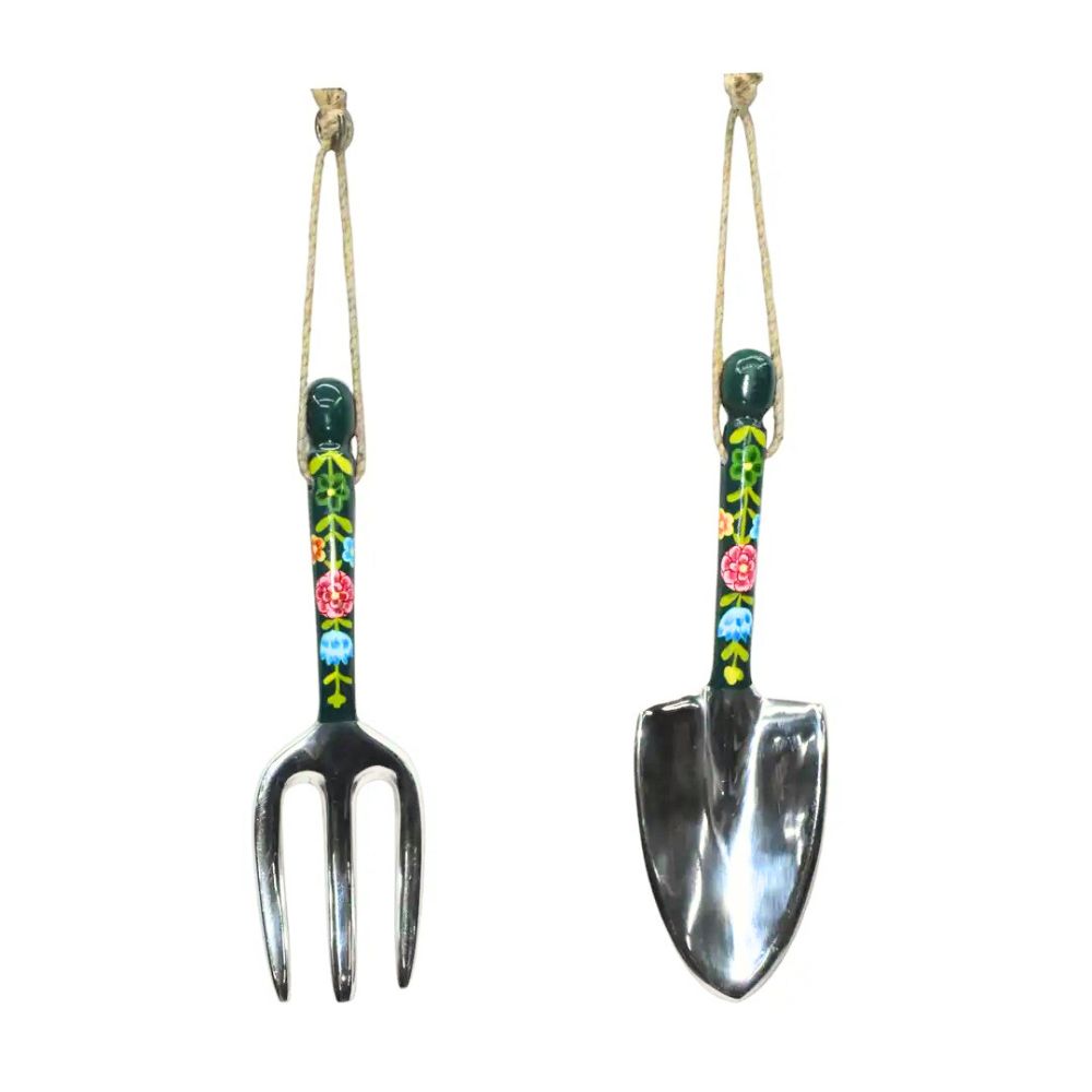 Hand trowel and rake are each hand cast in aluminum as single, durable pieces. The handles feature a hand-painted floral design. Tops are polished to a shiny finish. Each tool comes with a handy jute loop to easy storage.