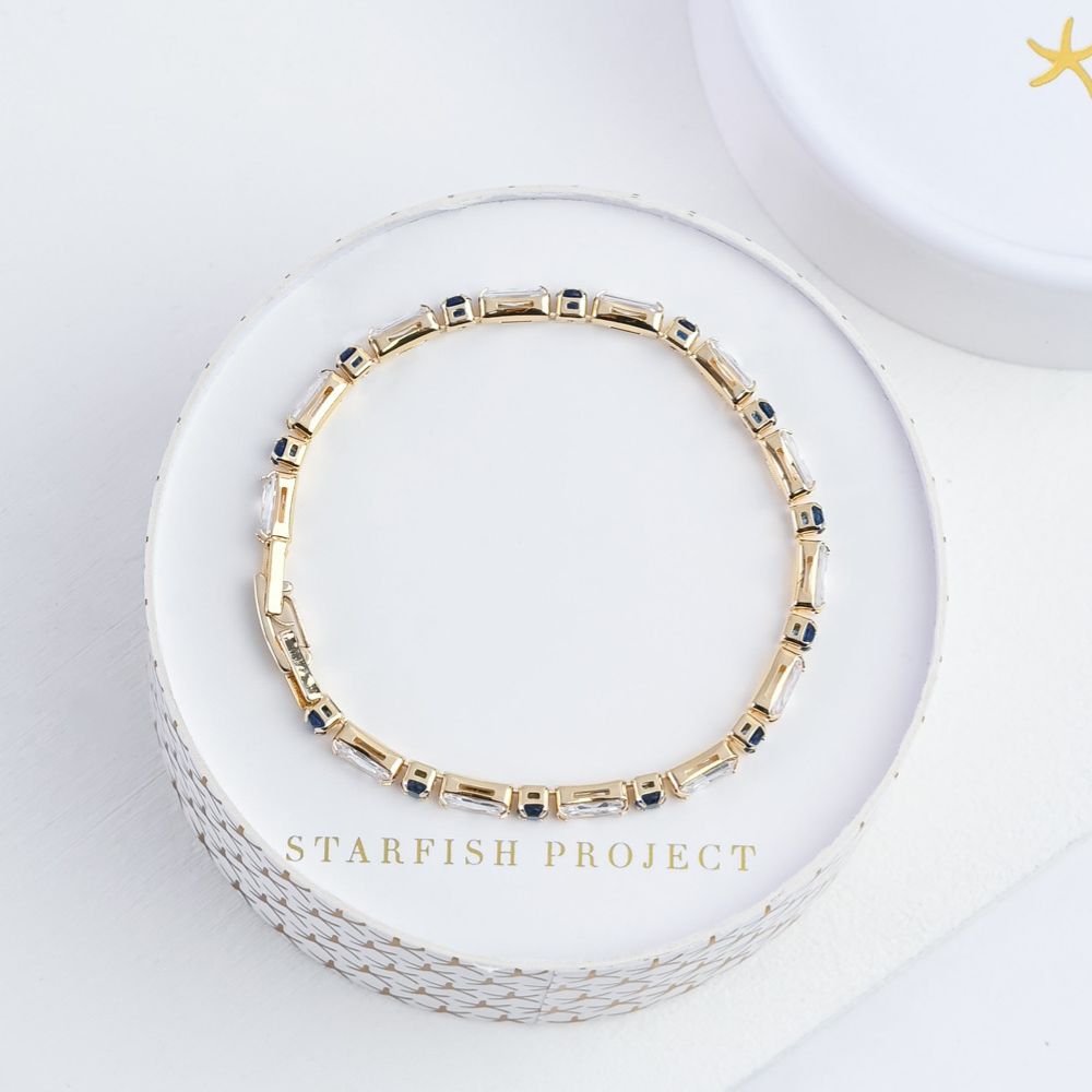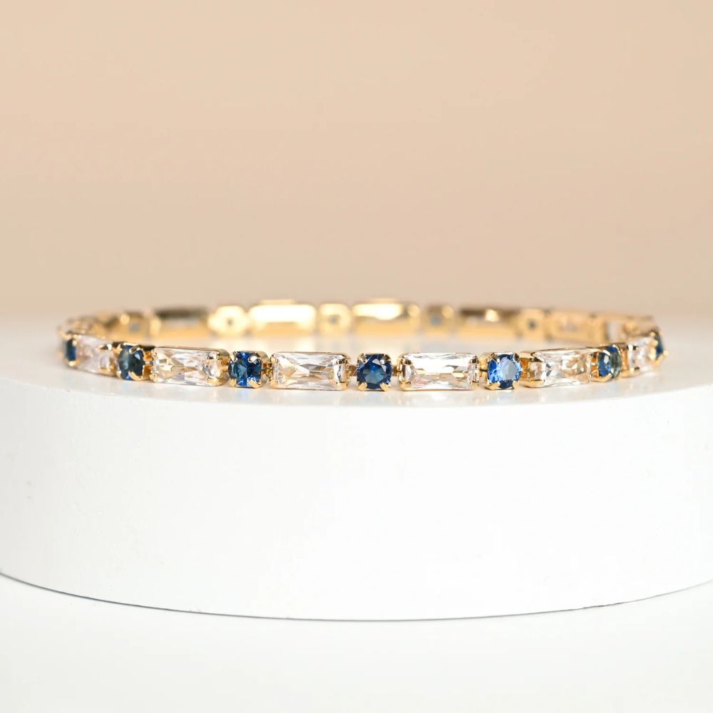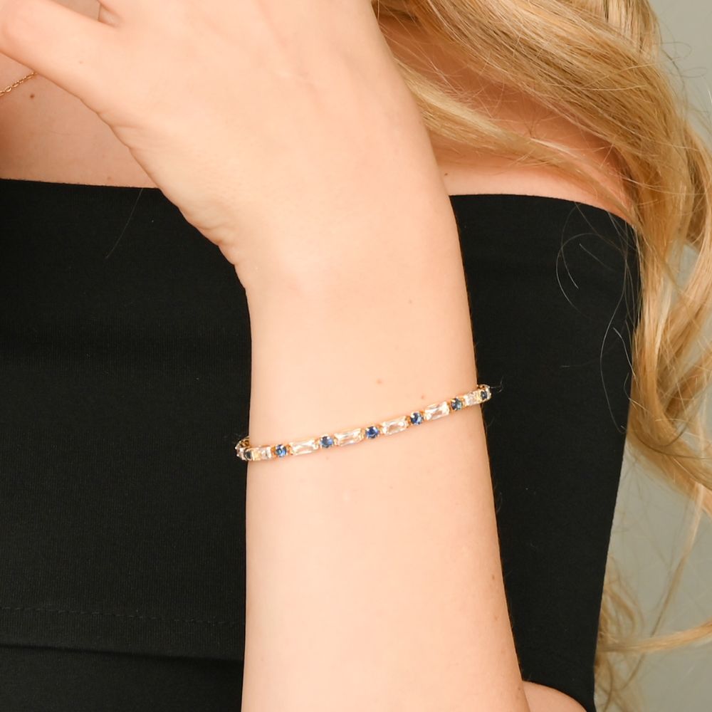 Upgrade your jewelry collection with this exquisite bracelet that features high-quality zircon stones that shimmer and sparkle with every movement, creating an awe-inspiring and captivating effect. The dainty stones are set in a timeless 14K plated gold tennis bracelet design, with accents of rich blue making this piece perfect for any occasion yet just the right choice for your big day!